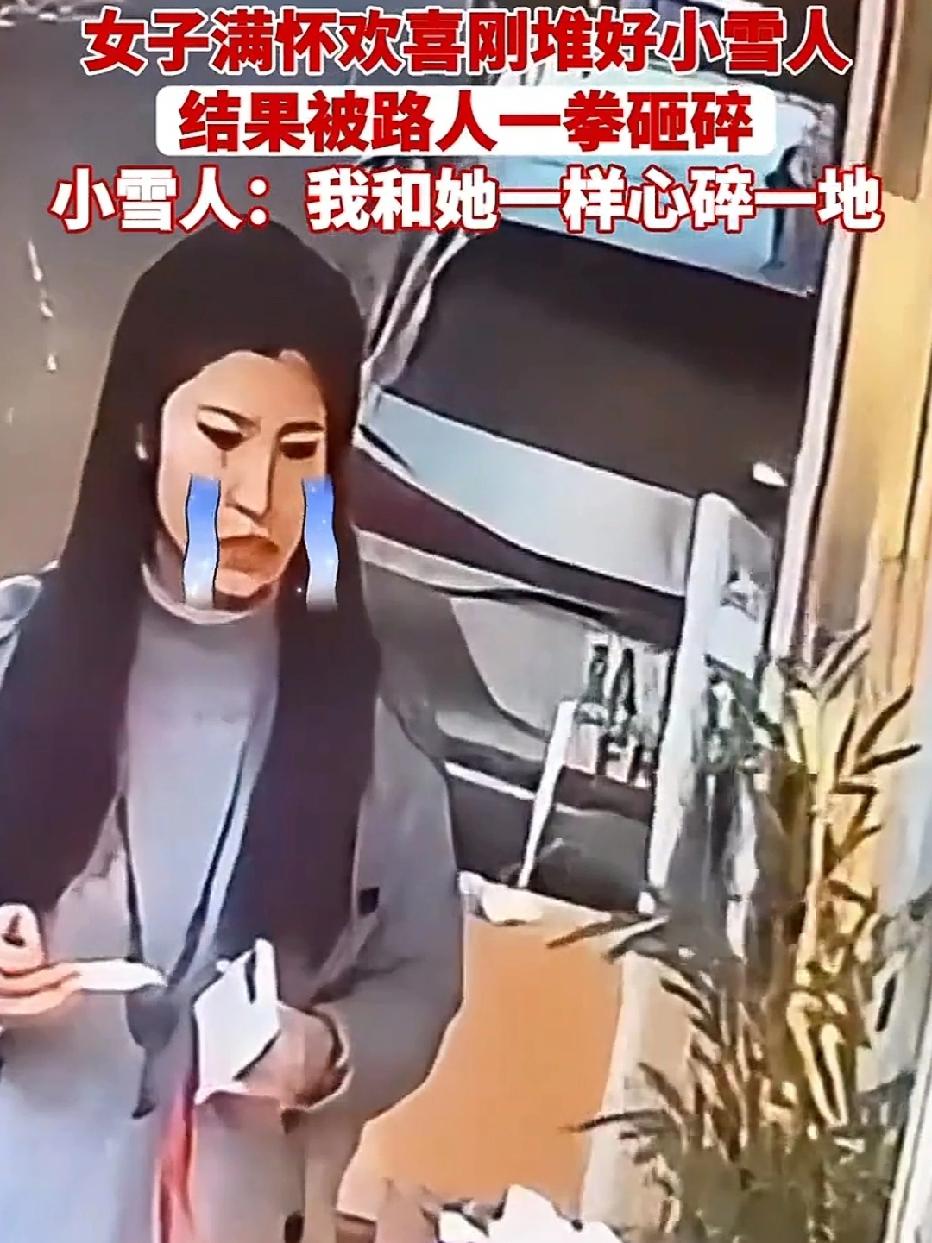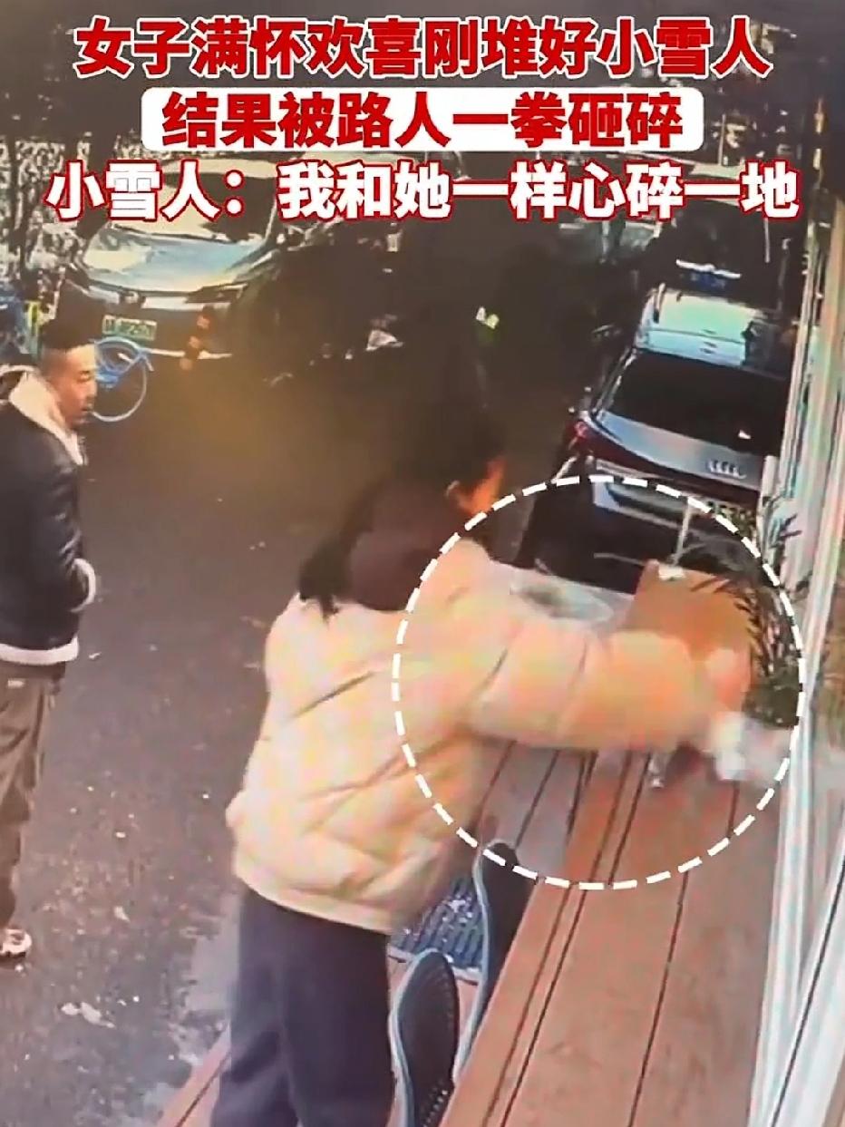 气愤!女子刚堆好的雪人被路人一拳砸碎,这一拳砸的到底是雪人还是心意? 12月13日北京,一名女子满心欢喜地堆好了小雪人,还没来得及好好欣赏,就被路过的人一拳砸了个粉碎。看着散落一地的雪块,女子的失落肉眼可见。 有人说这只是个小雪人,没必要上纲上线;也有人觉得,路人的行为太没素质,随意破坏别人的心血,是对他人心意的不尊重。 换作是你,遇到这种事你会不会生气?女子刚堆好的雪人被路人一拳砸碎 素质