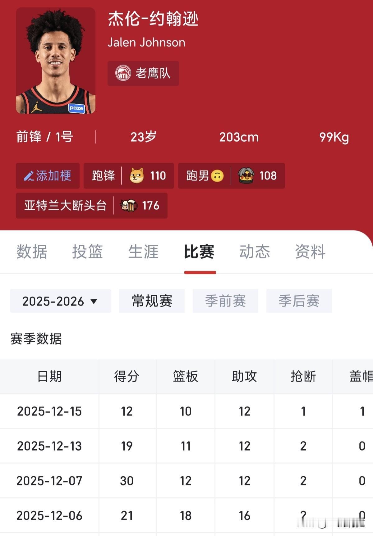 连续四场拿到三双,他是约基奇接班人还是威少接班人?可以肯定的是他比特雷杨更有前途! 老鹰队球星约翰逊今天又拿到三双了,他是魔术师过后最年轻做到连续四场拿到三双的球员。和约基奇并列本赛季连续三双场次最多的,他生涯一共拿到8次三双已经是老鹰队史最多了。 本赛季场均22.8分10.5篮板8.2助攻1.6抢断,已经属于顶尖球星水平,可是他的新秀赛季数据还不如现在的杨瀚森。机会是留给有准备的人,是金子哪里都会发光,这是真的。