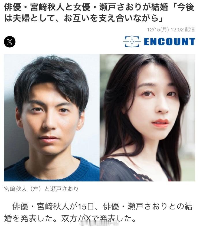 宫崎秋人结婚 同属于渡边娱乐事务所并以舞台剧为中心活跃的男演员宫崎秋人(35)和濑户康史的妹妹兼女演员瀬戸さおり(36)今日通过X联名官宣结婚喜讯。