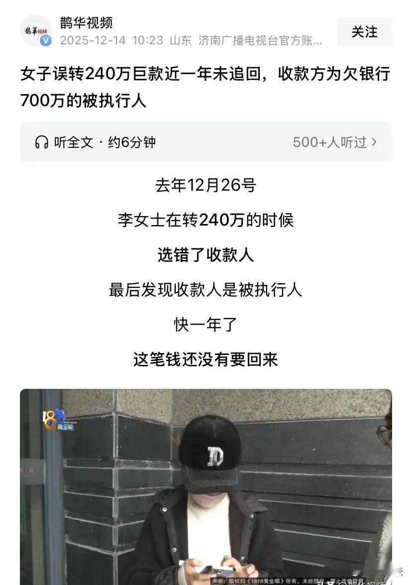 杭州李女士误将240万元转至同名的乙女士账户,发现该账户因乙女士欠银行700万已被冻结。李女士起诉后胜诉,却因货币“占有即所有”原则,其不当得利债权无法对抗法院强制执行,执行异议被驳回,她已提起执行异议之诉。 网友评论: 明明法院都判了钱是李女士的,结果还是拿不回,这合规也太不近人情了吧。 “占有即所有”听着挺专业,可转错的钱又没流通,凭啥要让受害者买单啊。 银行转错钱的时候追得比谁都急,轮到个人转错就只能认栽,这双标也太明显了。 真不信是单纯转错,同名不同姓还能转成功,背后说不定有别的隐情没说透。 古代判案还讲情理法平衡呢,现在只卡法律条文,完全不管谁是真吃亏,也太机械了。 乙女士本身欠了700万,这240万本来就不是她的,凭啥要拿来抵她的债啊。