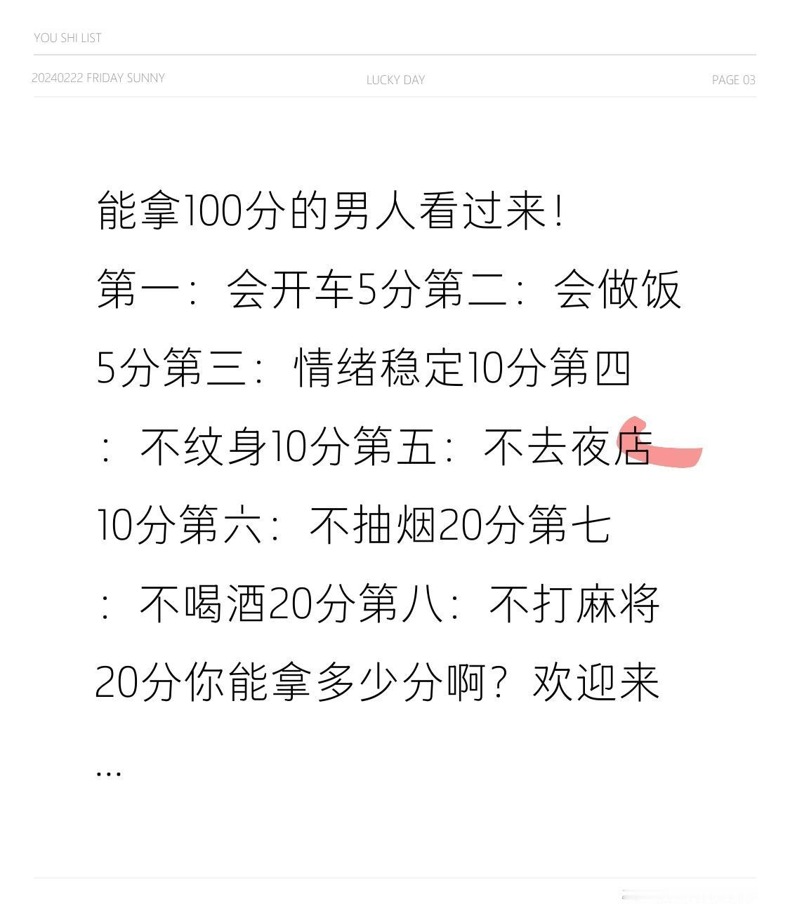 能拿100分的男人看过来! 第一:会开车5分 第二:会做饭5分 第三:情绪稳定10分 第四:不纹身10分 第五:不去夜店10分 第六:不抽烟20分 第七:不喝酒20分 第八:不打麻将20分 你能拿多少分啊? 欢迎来评论区交流。不抽烟不喝酒就是好男人吗? 男人评分标准