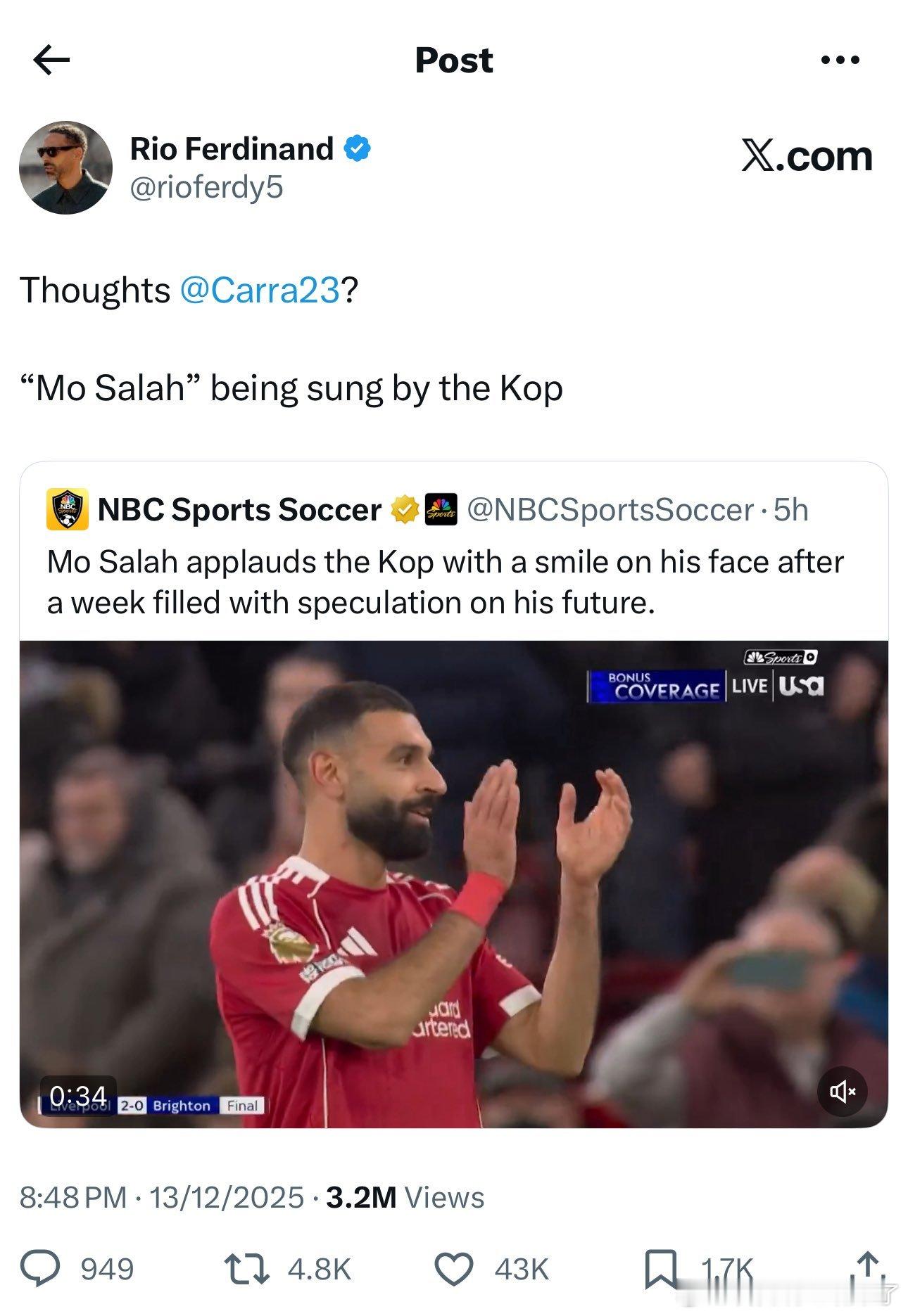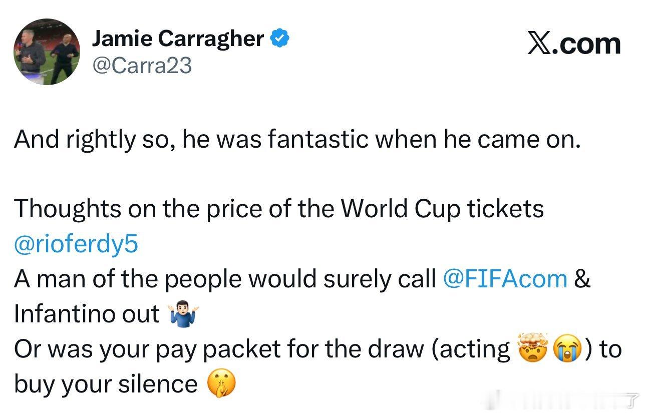 另一个大魔幻曼联名宿为萨拉赫辩护调侃利物浦名宿卡拉格里奥·费迪南德发布推文并提及卡拉格:"你的看法呢,杰米?球迷们在比赛结束后高呼萨拉赫的名字。"— 杰米·卡拉格回应并转移了话题:"这样做没错;他(萨拉赫)上场时的表现很出色。但你的看法呢,里奥,关于世界杯票价的问题?一个本应为票价过高而批评国际足联和因凡蒂诺的普通人,难道你参与抽签活动的报酬就足以让你保持沉默了吗?"