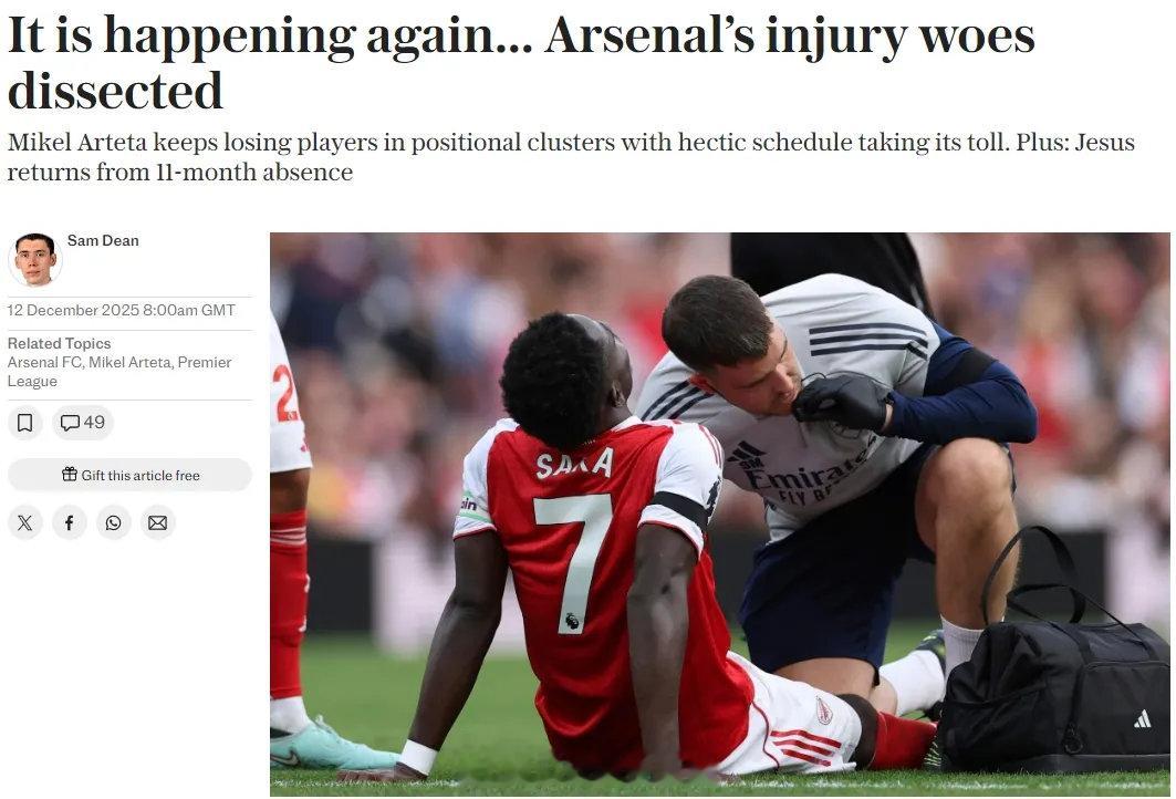 电讯报记者SD发文分析了阿森纳接二连三的伤病问题,看起来曼城和伤病是仅有的阻碍枪