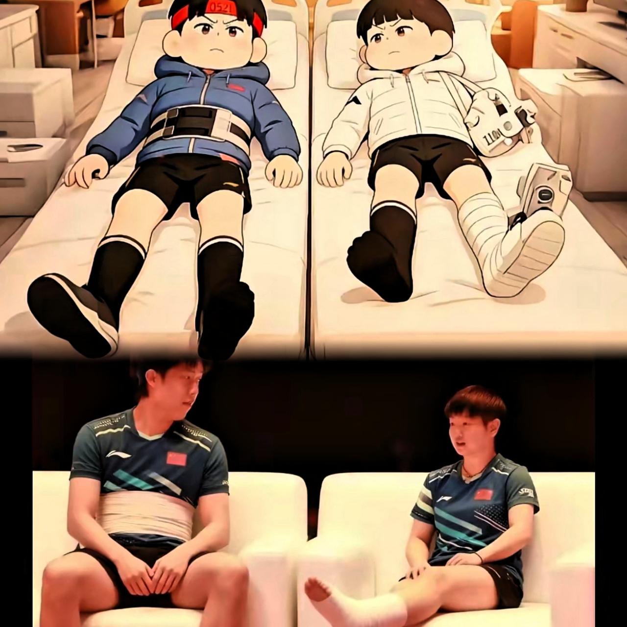 这下好了吧, 俩人都老实躺平了! 混双老祖直接进化成“逞强双人组”, 真的笑不活了!! 这图真是看得我又心疼又想笑!!! 别人搭档交流战术, 你俩搭档交流病情… 秒变“一生一起疼”好病友! 躺都躺下了, 怎么表情还像想再干一架似的? 啥都能配平, 这宿命感我是服了! 前两天还在心疼, 看到这张图突然就释怀了! 不过王老师的床是不是买短了点儿啊! 大头,都躺病床了, 鞋脱一只、发带摘了行不行? 莎莎也是,可怜兮兮的, 躺平了还不放下她的小白包! 这届网友真是天才出品!!! 连jiojio都要配平! 头哥为啥只穿一只鞋? ——这还不懂? “主打一个陪伴”呗, 仪式感不能少! 果然想看什么都得靠自己, 网友出手,神图我有!