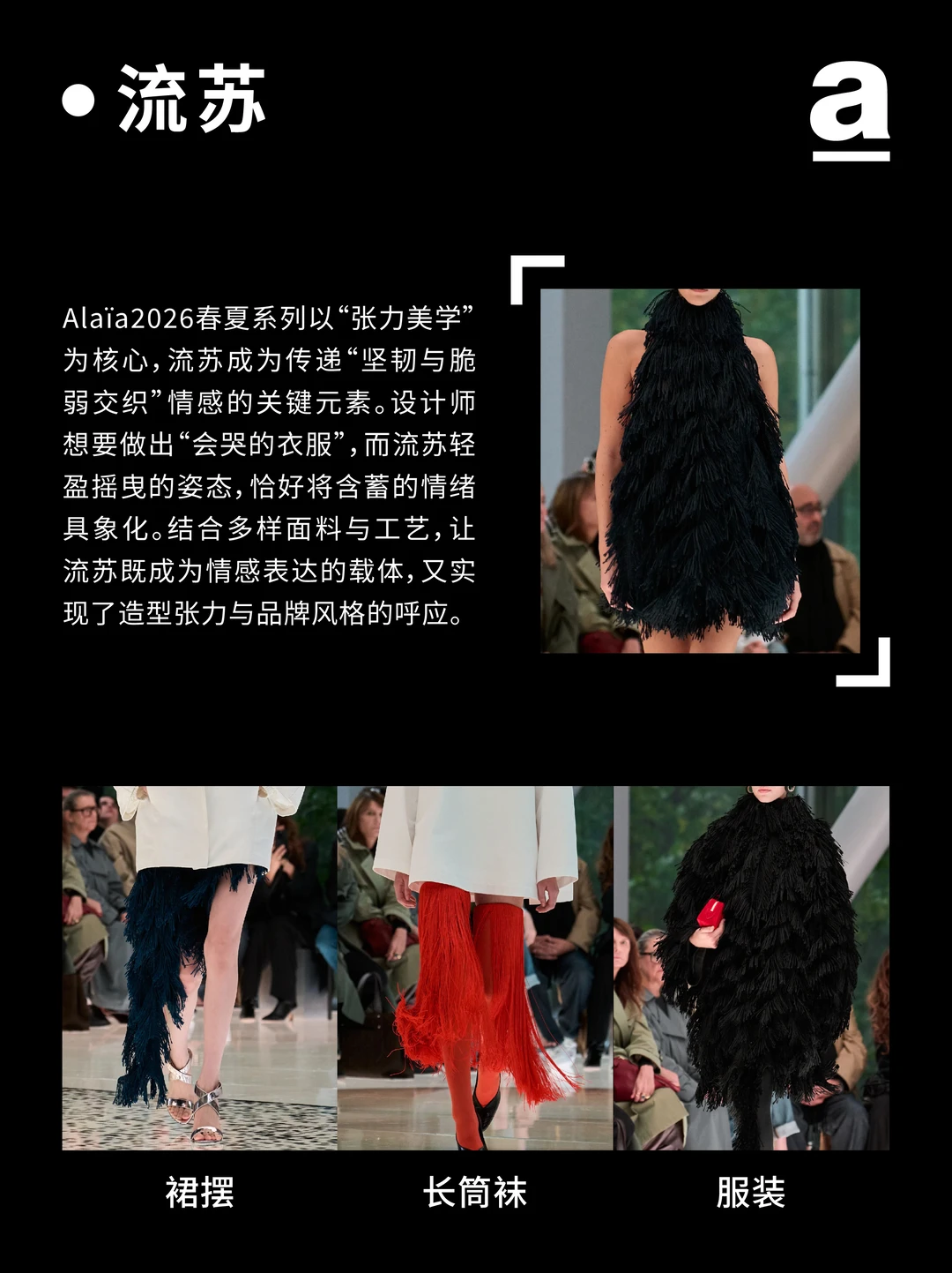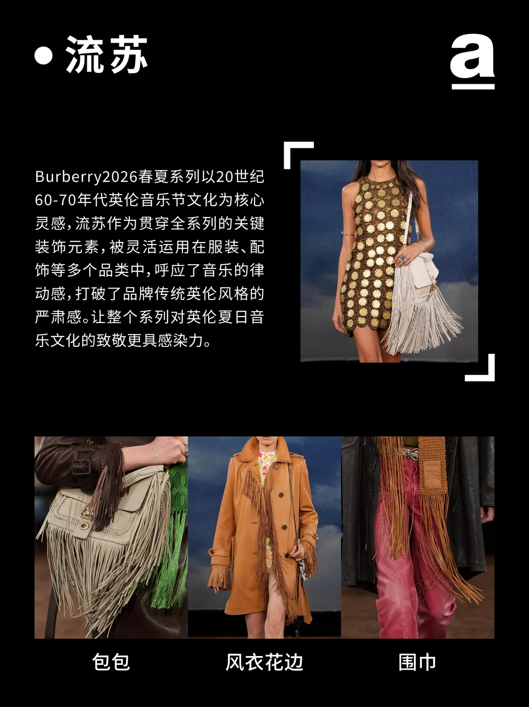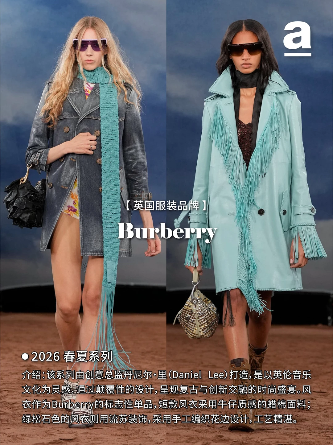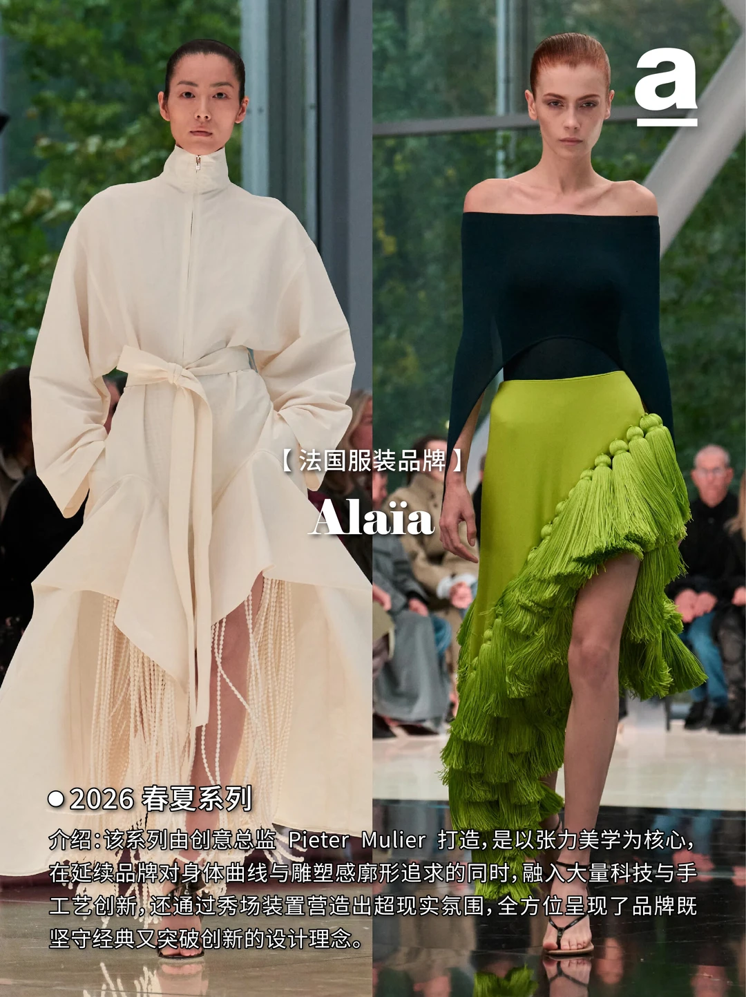 2026春夏高级定制时装周向时尚界宣告对「奢华」的定义正在重构——不再是单纯的材质堆砌,而是通过面料的创新应用、工艺融合与理念表达,实现传统与现代、环保与精致、感性与功能性的平衡。 【 流行风向 】 自然野趣:流苏 逃离都市喧嚣的诉求催生了「自然野趣」的流行,流苏、植物纹理、原生质感面料成为核心表达。 复古解构:绣花 复古回潮不再是简单复刻,而是通过面料重组与工艺创新,赋予经典元素新的生命力。 【 关键品牌 】 Burberry Alaïa Bora Aksu Erdem