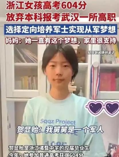 604分放弃本科读高职!这位考生的选择,炸出无数争议 高考604分是什么概念?在浙江,这超出一段线114分、超特招线12分,稳妥上本科不说,甚至能冲击不错的公办院校。可谁也没想到,考生贺显贻却拿着这份“亮眼成绩单”,毅然放弃本科,选择了武昌职业学院的高职专业! 消息一出,全网直接炸了锅。有人直呼“看不懂”:“十几年苦读就为了考个好本科,这分数读高职不是浪费天赋吗?”还有家长替他惋惜:“要是我家孩子,肯定劝他选本科,学历这块不能输在起跑线上。” 但贺显贻的选择并非一时冲动。据了解,他从小就对航空领域充满热爱,而武昌职业学院的无人机应用技术专业,不仅有成熟的实训体系,还与多家航空企业有合作,能提供更精准的职业培养和就业渠道。对他而言,与其在本科读一个不感兴趣的专业,不如深耕高职的特色领域,掌握一门过硬的技术。 其实这两年,“高分选高职”的案例并不少见。随着职业教育的发展,越来越多的高职专业凭借精准的人才培养、高就业率,成为考生的新选择。但争议依然存在,核心还是“学历论”的惯性思维。有人觉得本科文凭是“敲门砖”,高职再优秀也矮人一截;也有人认为,在技术为王的时代,过硬的技能远比一纸文凭更重要。 贺显贻的选择,恰恰撕开了“唯学历论”的口子。教育的本质不是追求文凭的高低,而是让每个人找到适合自己的发展道路。你觉得他的选择是“任性”还是“清醒”?评论区聊聊你的看法~