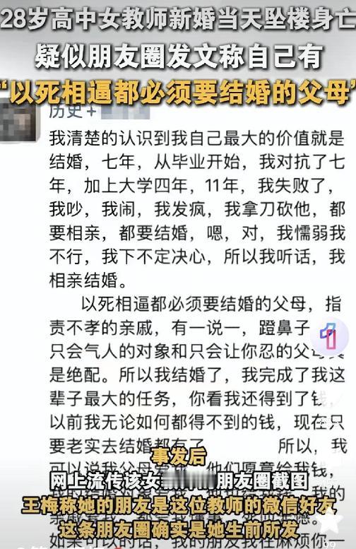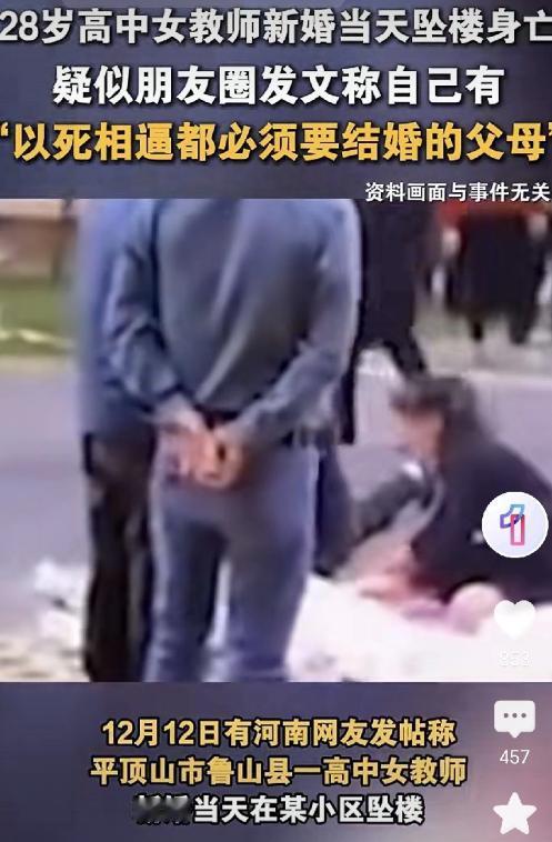 这回满意了?12月14日报道,河南平顶山,一28岁女教师发朋友圈: 父母以死相胁,要她相亲结婚,她哭她闹,亲戚说她不孝,她妥协了,找了个对象,对象蹬鼻子上脸,只会气她,父母不但不管,还要她忍耐,女子无奈之下,举办了婚礼,婚礼当天,女子登上7楼,她一跃而下,当场去世,女子留言: 我完成任务了,朋友再帮我一次吧,把我火化了吧,把我gu灰扬了…… 12月10日,河南平顶山鲁山县一个普通小区里,原本还沉浸在婚礼气氛中,楼道墙上贴着鲜红的喜字,地上是昨晚放鞭炮留下的碎屑,很多人还没来得及感受喜庆散去的余温,一声闷响突然从高处传来,把所有人都惊住了。 28岁的李某(化名),一名高中历史老师,身上还穿着新买的婚纱,从7楼跳了下去,当场身亡。 听到动静的邻居纷纷跑出来,一楼刚装修好的小院里,一个盖着粉色被子的身影静静躺着,没有任何反应。 很快,警车和救护车赶到,小区里的人越聚越多,业主群里开始疯狂传消息,说话的人手都在抖:“是今天要结婚的新娘,从楼上跳下来了。”没有人敢相信,这样的日子,会以这种方式收场。 李某为什么会走到这一步,其实早有痕迹,她生前最后留下的一些文字,把多年压在心里的痛全都说了出来。 李某17岁上大学那年起,父母就开始不停地提结婚这件事,一提就是11年,在父母眼里,女孩子读书、工作,最终目的只有一个,就是早点嫁人。 她不是没反抗过,哭过、吵过,也用过极端方式表达自己的痛苦,可换来的只有一句话:“到年纪不结婚,就是不懂事、不孝顺。” 亲戚们也轮番上阵,没有人问她想不想、愿不愿意,只会指指点点,说她书读得再多也没用,说女人最终还是得靠婚姻。 那些话一天天压下来,让她喘不过气,最让她绝望的是,父母甚至用生命威胁她,如果不结婚,他们就去不活了,四千多个日夜的拉扯之后,她彻底累了,只能低头答应,接受这场自己并不想要的婚姻。 可答应结婚,并没有让李某轻松,父母安排的对象,并不是她心里认可的人,相处过程中,对方不仅不体贴,还经常让她受气。 李某忍不住向父母倾诉,希望能得到一点支持,结果听到的却是“忍忍就过去了”“哪家过日子不是这样”,那些逼她结婚的人,在她真正难受的时候,却选择站在一旁,让她自己扛。 李某本该拥有很不一样的人生,2022年,她以笔试和综合成绩双第一的成绩,考进了鲁山县一所高中的教师队伍。 学生眼里,她温柔认真,为了劝回逃课的孩子,能翻两座山去找人,还会自掏腰包给学生买书,同事们也都说,她脾气好,从不把情绪带给别人。 就是这样一个努力、独立、善良的年轻人,却被“必须结婚”这四个字一步步逼到了角落。 拍婚纱照的时候,她几乎没怎么笑,照片里的眼神空空的,李某在留下的文字里写过一句话:“我听话了,父母给我钱,对象给我钱,亲戚都夸我懂事。”可这种被夸的“懂事”,是她用自由、尊严和快乐换来的。 婚礼当天,所有流程都准备好了,她趁着空隙上了7楼,最后看了一眼这个让她感到窒息的世界,选择了结束。 哪怕走到生命尽头,李某想的还是别人,她拜托朋友,等事情结束后把她火化,找个有阳光、有风的日子,把骨灰撒掉,说她想真正自由一次。 李某甚至还惦记着给一楼的住户道歉,怕自己的事影响到别人,这样一个连离开都怕麻烦他人的人,生前却没有被真正地理解和心疼。 两边家庭都陷入了痛苦和自责,有人上门慰问时,只轻描淡写地说她可能有抑郁情绪,却没人愿意正视,那场持续了11年的催婚,才是一步步把她推向深渊的原因。 她的学生和同事得知消息后,哭得很厉害,那个在黑板前认真讲课、在错题本上写鼓励话语的老师,再也回不来了。 这件事传到网上,很多人看完都觉得心口发紧。 有人说,这根本不是关心,是把孩子当成完成任务的工具,也有人直言,有些父母的面子,是用孩子的命换来的。 婚姻从来不是人生的标准答案,更不该成为控制孩子的理由,真正的爱,不是逼迫,不是威胁,真正的孝顺,也不是牺牲自己去成全别人。 希望这样的悲剧,能让更多人清醒一点。 孩子不是为了满足父母期待而活,他们的感受和幸福,永远比外人的眼光重要。 也希望每一个正在被催婚、被逼迫的人都能记住,人生是自己的,只要活着,就还有选择的可能,千万别用别人的错误,毁掉自己的一生。 对此你怎么看? 信源:红星新闻
