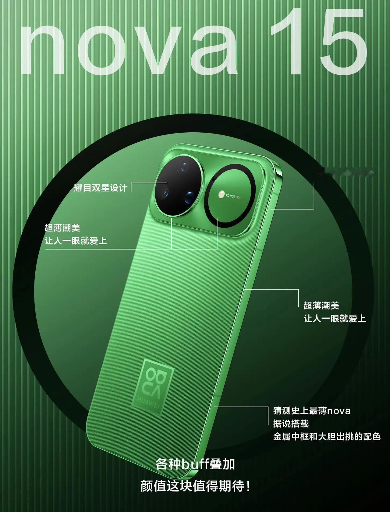大家都知道,nova 系列一直都是年轻人的新宠,无论是外观还是颜值都深受大家的喜爱。 就在今天,华为终端官方微博释放新品官宣信息,全新nova 15系列会在12月22日发布,而且即日起就可以开始预订咯。从发布的官宣海报上就能明显看出nova 15系列在外观和影像方面实现了全面的革新。目前已经曝光了nova 15系列的四种时尚配色,分别是带感绿、好搭紫、零度白、幻夜黑,该说不说多种配色的提供更能满足大家的个性化需求,每一款配色都有其独特的魅力,而且从海报上看,nova 15系列这次或将是直屏设计,加上镜头模组的横向双圆环设计,利落感十足,可以说是史上最好看的nova了。 影像方面,微博文案里那句 “「枫」头正劲” ,似乎在向大众透露新机在影像能力上有重大突破,上一代nova 14系列就搭载了红枫原色影像,获得了不少好评,猜测此次或将继续搭载红枫原色,而且前置自拍一直作为nova的拿手好戏,此次nova 15系列的前置或将带来更大升级,说不准就在前置支持红枫原色,带来更加真实的色彩还原能力。 在通信方面,nova 15系列或将迎来全新升级,通信上可能会继续搭载天通卫星通信,此外,还可能支持屋网通信,在没有网络信号覆盖的区域,通信能力将再升级。如果真的是这样的配置,真的可以说是超级nova了。 总体而言,作为nova系列的最新力作,nova 15系列值得期待。华为12月新品发布会官宣