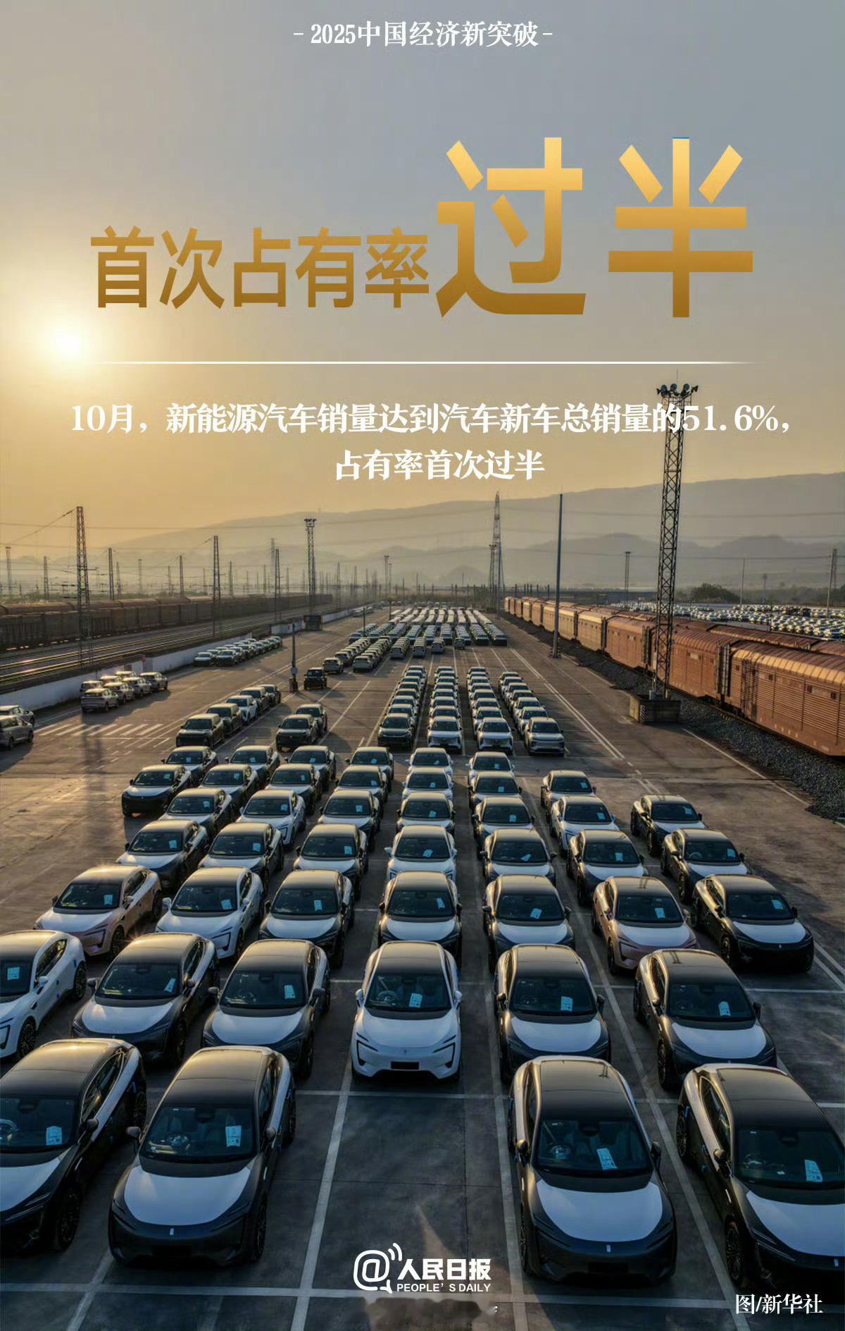 2025中国经济新突破10月新能源汽车销量达到汽车新车总销量的51.6%,占有率首次过半 旺盛的内需是拉动产业升级强有力的基础