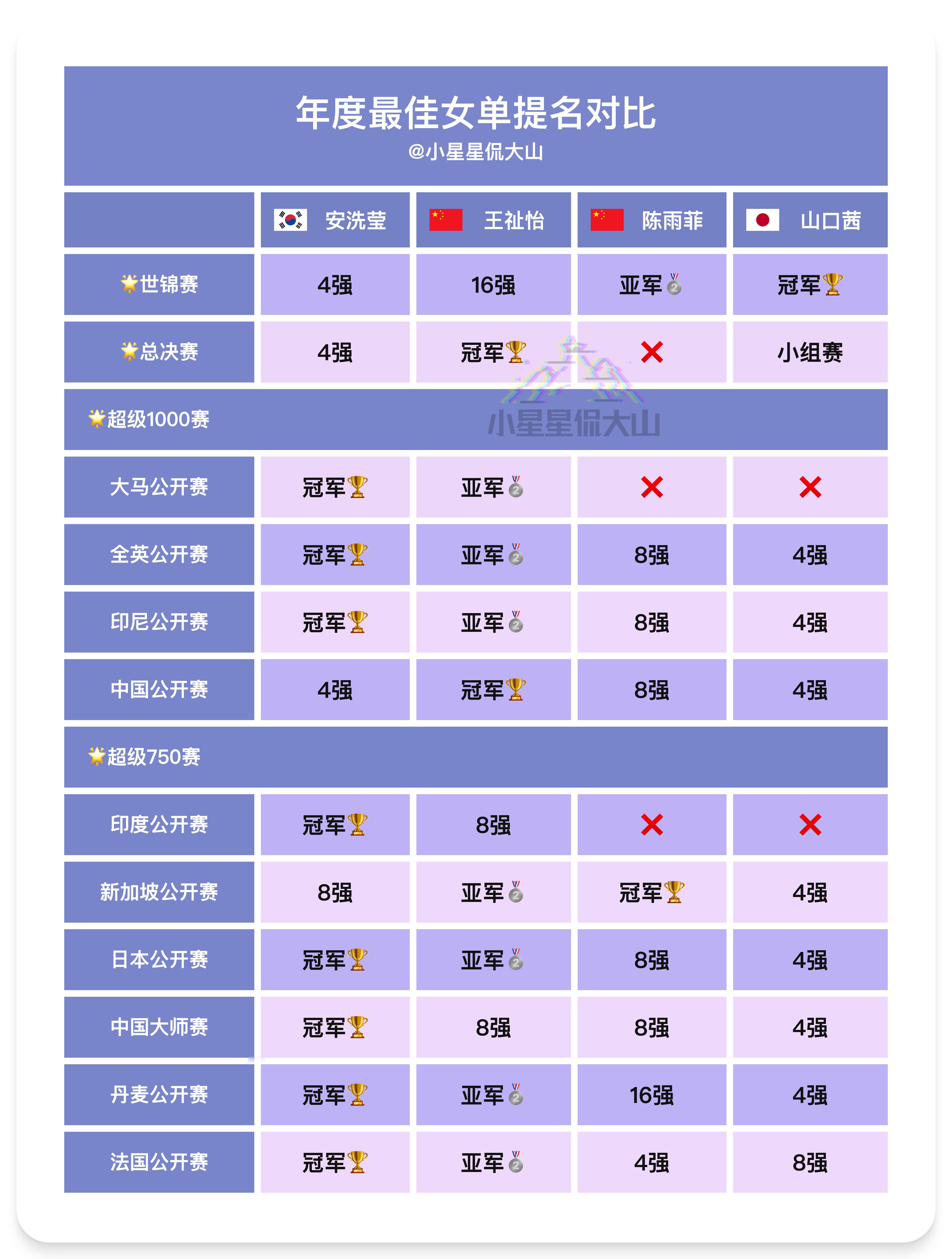 年度最佳女单提名成绩羽联总决赛颁奖典礼 【2025年度核心奖项最终得分由两部分构成】(1)过去52周内累积的世界排名积分(2)由五人专家小组在每站指定赛事(包括2024年世界羽联世界巡回赛总决赛、所有超级1000和超级750赛事及2025年道达尔能源世界羽联世界羽毛球锦标赛)后进行的投票评分🌟2024年年终总决赛与2025年世锦赛采用双倍计分制🌟