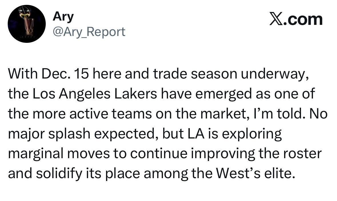 Ary小道消息,湖人不会有大操作:据我所知,随着12月15日到来、交易季开启,洛杉矶湖人队已成转会市场上动作较活跃的球队之一。预计不会有重磅引援,但湖人正在探讨一些小幅度运作,以此持续补强阵容,稳固自己在西部豪强中的席位。