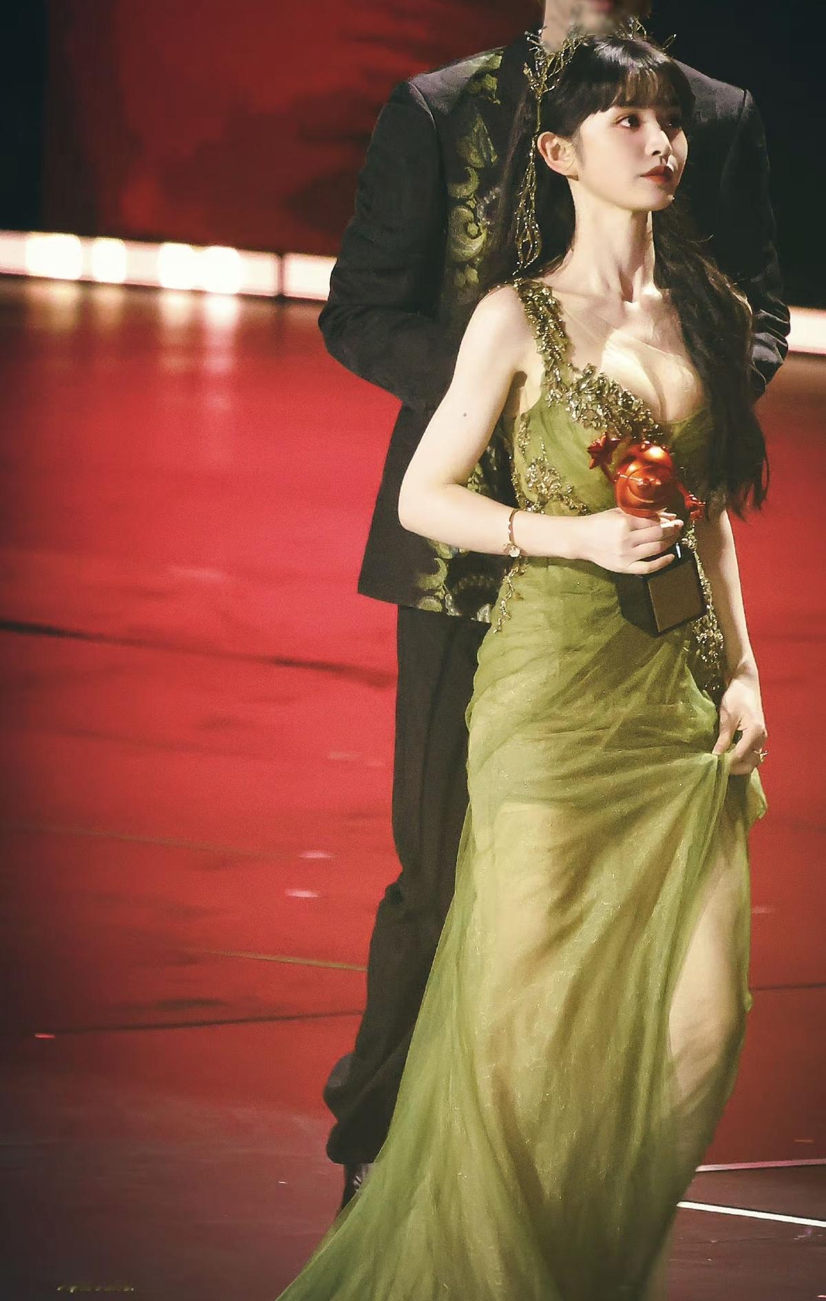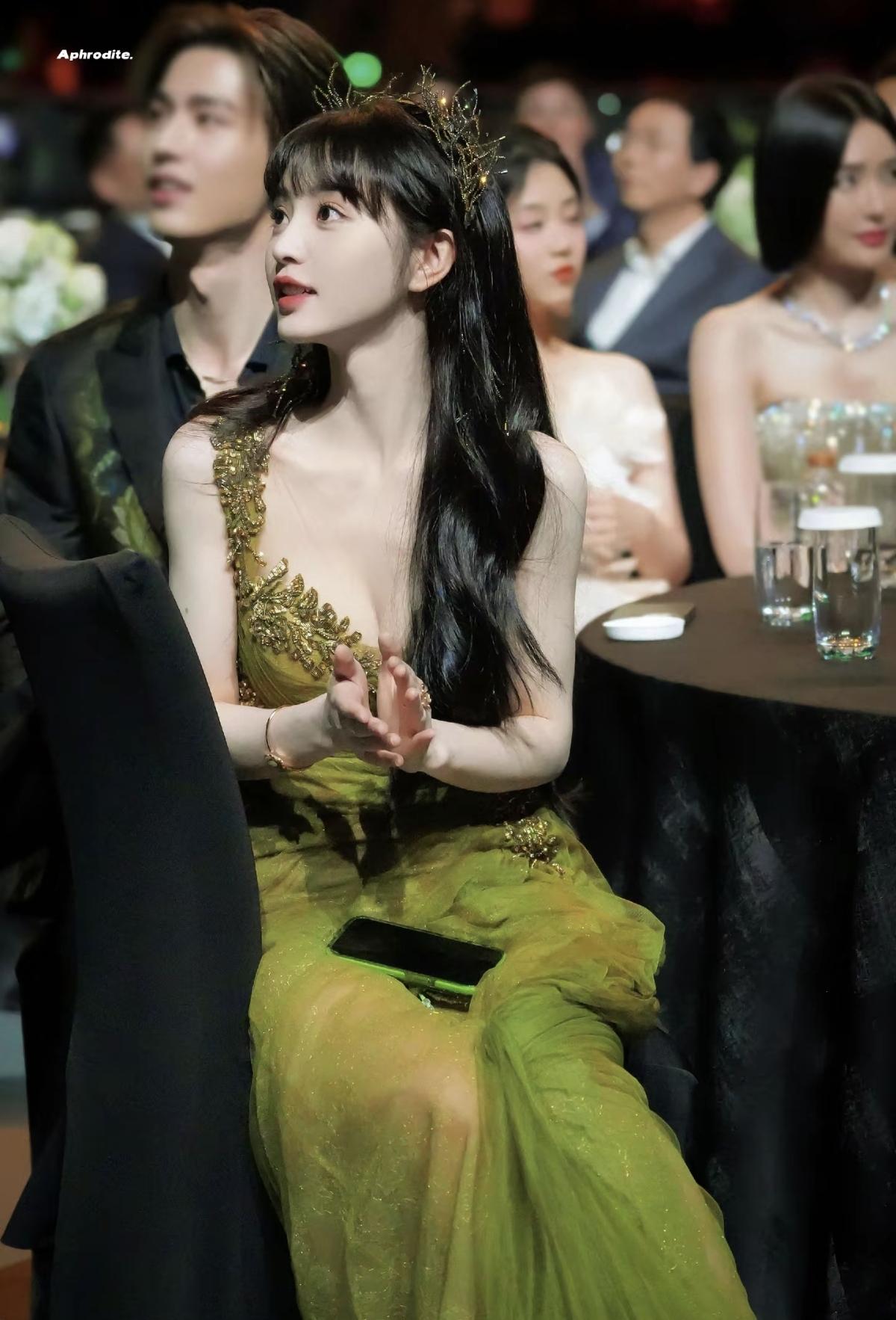 不是直白的闪耀,是缎面折射的细腻光泽,是剪裁勾勒的优越曲线——程潇把香槟色礼服