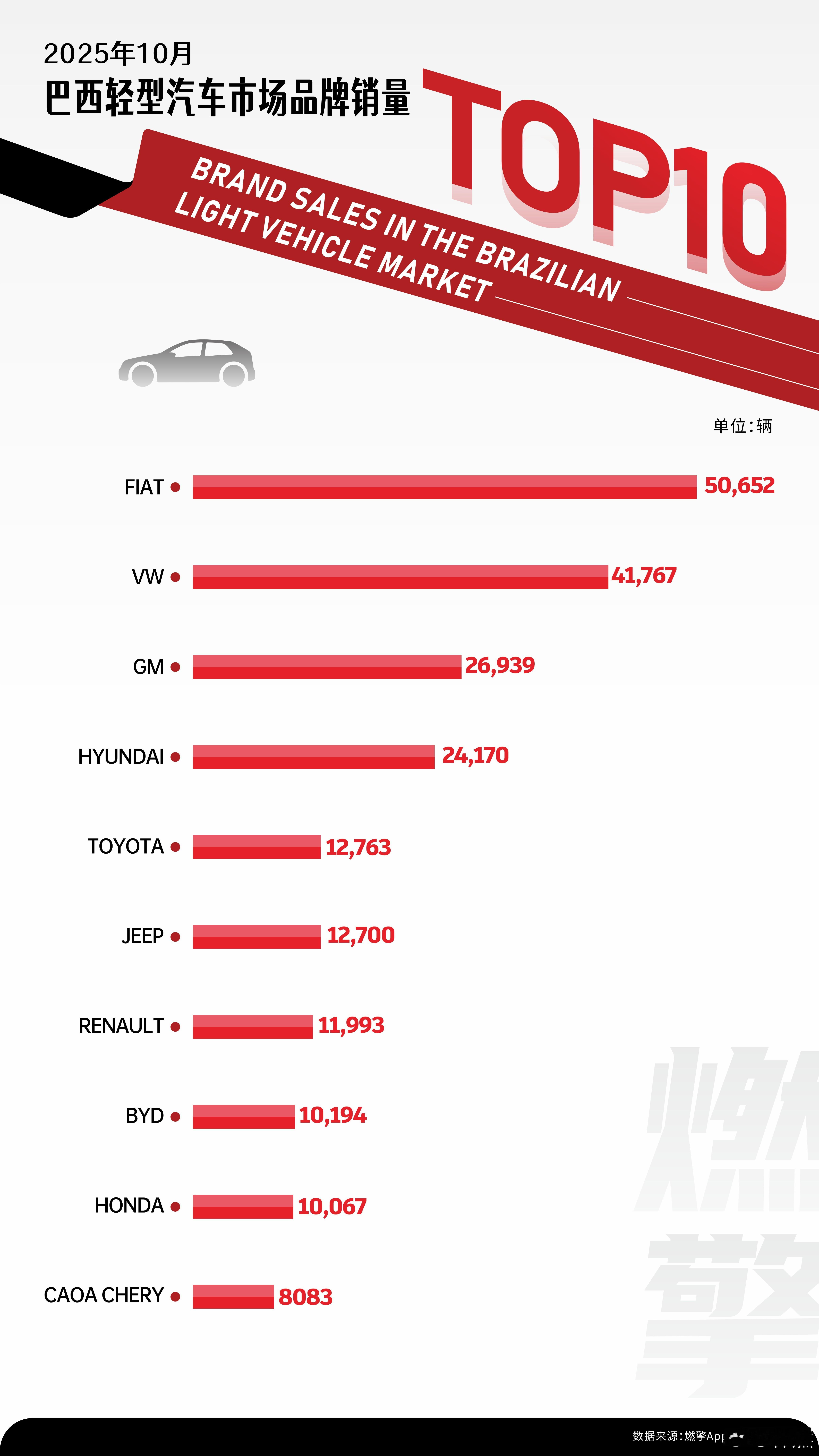 巴西轻型车市:比亚迪奇瑞遥遥领先10月,巴西轻型汽车市场品牌销量格局呈现出欧美品牌稳固领先、中国品牌取得关键突破的态势。传统品牌凭借深厚的本地化根基占据主导,而中国品牌则通过新能源与合资模式成功跻身主流阵营,反映出市场正逐步走向多元化竞争。在市场领先阵营中,菲亚特与大众凭借显著的本地化优势保持领先。菲亚特以50652辆的销量位居榜首,其经济型小型车如Palio系列,精准契合了巴西城市家庭对高性价比通勤车型的需求,配合本地化生产带来的成本优势,巩固了其市场地位。大众以41767辆的销量紧随其后,依靠本地生产线及长期积累的产品口碑,通过紧凑型轿车和SUV满足主流家庭用车场景。通用、现代等品牌则以两万余辆的销量规模,凭借经典车型维持着重要的市场份额。中国品牌在本月实现了重要突破,共有两个品牌进入前十。比亚迪以10194辆的销量排名第八,其纯电SUV车型如元PLUS,凭借较高的配置水平和续航能力,成功切入巴西新兴的新能源汽车市场,顺应了当地逐步强化的环保政策趋势。CAOA奇瑞(奇瑞与巴西CAOA集团的合资品牌)以8083辆的销量位列第十,主要依靠经济型SUV产品,结合性价比优势和本地合资渠道,在入门级家用车市场占据一席之地。相比之下,丰田、本田等日系品牌的市场表现相对平缓,月销量维持在一万辆级别。这在一定程度上表明,其产品在成本控制与本地市场适配方面,既面临欧美品牌本地化体系的竞争压力,也开始受到中国品牌在新能源及性价比维度上的市场分流。展望未来,菲亚特、大众等传统品牌的领先地位在短期内预计仍将保持。但中国品牌展现出明确的增长潜力:比亚迪若能在巴西推进本地化生产以进一步优化成本,其新能源车型销量有望持续攀升;CAOA奇瑞的合资模式则可深化产品本地化适配,巩固并扩大其在性价比市场的份额。同时,巴西新能源政策的持续推进,也将为中国品牌的新能源车型提供更广阔的市场空间。大v聊车