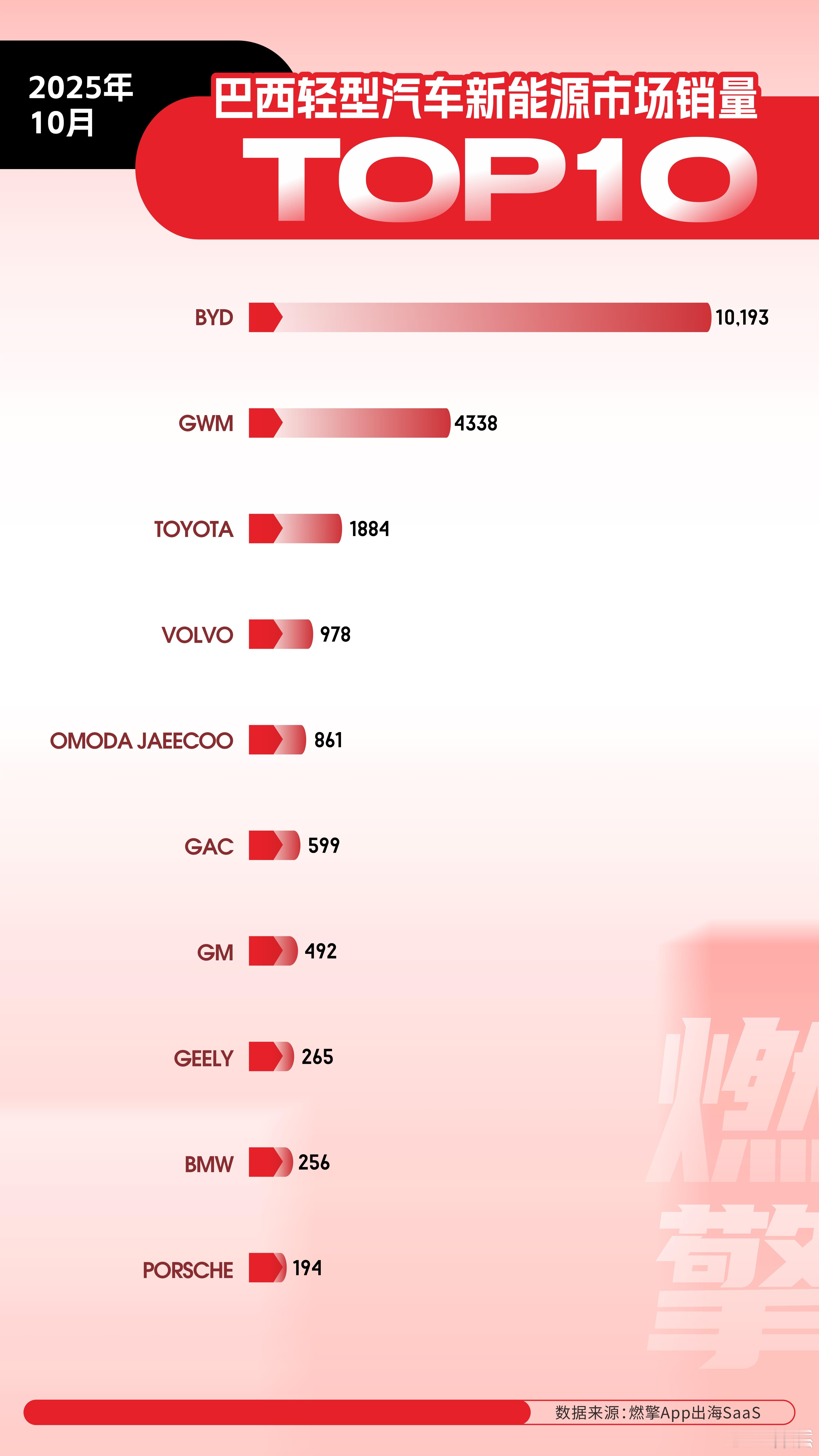 巴西新能源轻型车:比亚迪第一,长城第二10月,巴西轻型汽车新能源市场呈现出以中国品牌为主导的鲜明竞争格局。比亚迪凭借显著优势占据领先地位,多个中国品牌在细分市场积极布局,而传统及豪华品牌的电动化转型则相对滞后,这与巴西市场起步阶段注重家用适配性与性价比的特点高度契合。在销量榜单中,中国品牌占据主导地位。比亚迪以10193辆的月销量位居榜首,第二名长城汽车4338辆。比亚迪的成功得益于精准的产品策略:元PLUS等纯电SUV车型满足了当地家庭对空间和续航的核心需求,同时其逐步推进的本地化布局也有助于提升价格竞争力,使其成为巴西新能源市场的标杆品牌。长城汽车则凭借混合动力及纯电SUV产品,以较高的性价比和一定的越野属性,在中端家用市场占据了一席之地。相比之下,传统及豪华品牌的市场表现较为平淡。丰田以1884辆的销量反映出其新能源产品导入节奏相对缓慢。沃尔沃、宝马、保时捷等豪华品牌销量均不足千辆,其高端产品定位与当前市场主流的大众化、家用化需求存在一定错位。通用汽车等美系品牌的电动化产品也尚未展现出强劲的市场竞争力。除头部品牌外,多个中国品牌也已进入前十榜单,形成了差异化的市场覆盖。OMODA JAECOO以861辆的销量,凭借年轻化设计吸引特定消费群体;广汽集团与吉利汽车则分别以599辆和265辆的销量,主打入门级市场,服务预算敏感的通勤用户。这种多品牌、全价位的布局,使中国品牌在巴西新能源市场实现了广泛的场景覆盖。展望未来,中国品牌的主导地位预计将进一步巩固。巴西新能源市场的整体发展,将为具备先发和性价比优势的中国品牌提供持续的成长空间。大v聊车