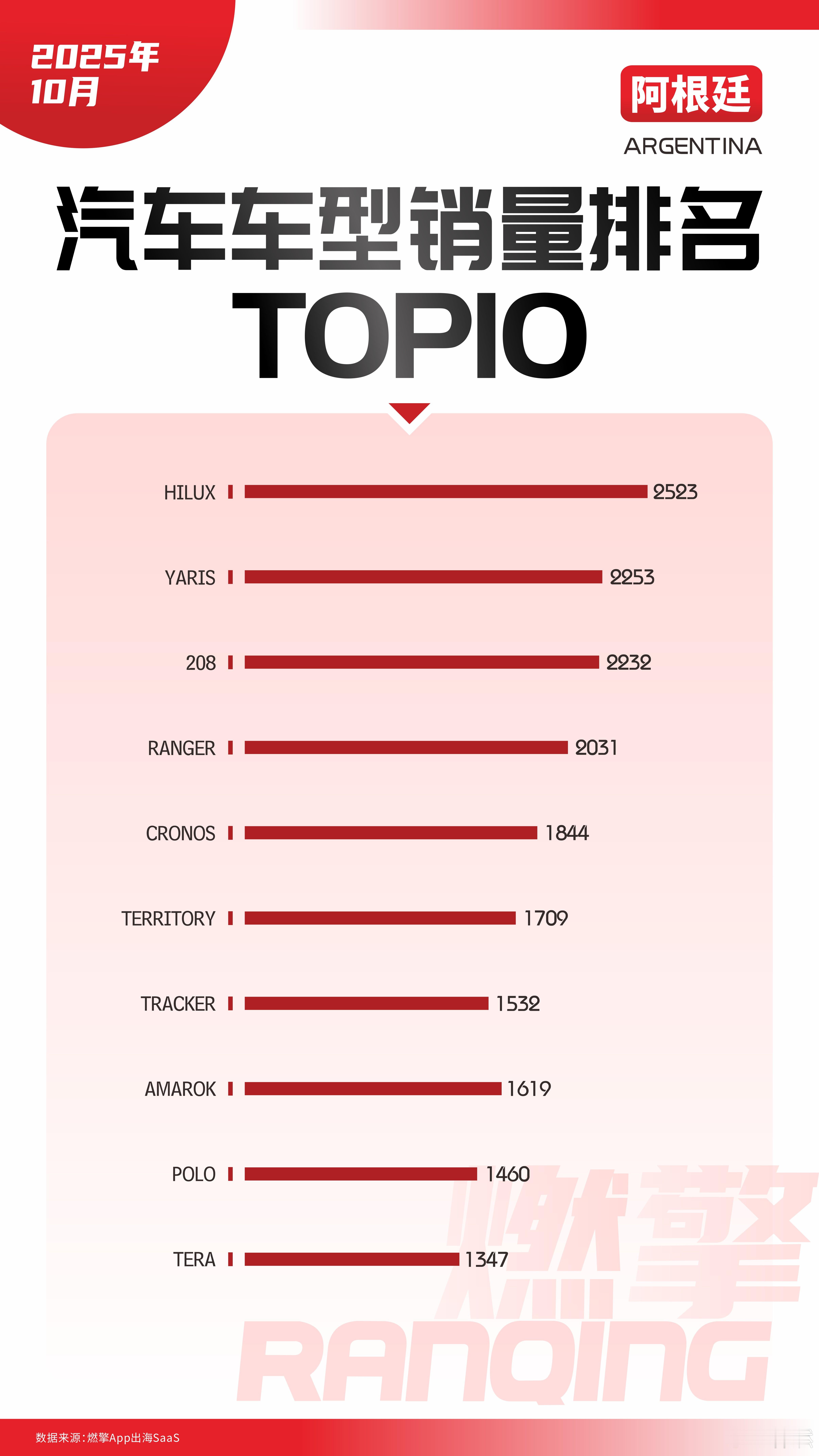 阿根廷汽车市场:中国品牌车型尚未进入前十10月,阿根廷汽车市场销量前十的车型榜单清晰地反映出当地独特的消费特征。皮卡凭借其强大的商用属性占据核心地位,小型轿车构成了城市出行的基础,而家用SUV则展现出逐步增长的市场需求。这一格局与阿根廷农业运输需求旺盛、城市通勤注重经济性的用车环境高度契合。皮卡是阿根廷市场毋庸置疑的主力车型。丰田HI LUX以2523辆的销量位居榜首,福特RANGER和大众AMAROK也位列前十。这类车型凭借出色的装载能力和耐用性,精准满足了农业及乡村货运等核心商业需求。配合丰田、福特等品牌长期建立的产品口碑,皮卡牢牢占据了市场刚需的头部位置。小型轿车是城市通勤的基础选择。丰田YARIS、标致208、菲亚特CRONOS和大众POLO等车型分别取得了2253辆、2232辆、1844辆和1460辆的销量。这些车型以亲民的价格和经济的油耗,适应了城市交通环境,成为众多家庭日常代步的首选,构成了市场稳定的基本盘。家用SUV市场正逐步发展。福特TERRITORY和雪佛兰TRACKER分别以1709辆和1532辆的销量上榜。这些车型在提供城市驾驶舒适性的同时,也兼顾了一定的道路通过性,满足了家庭用户兼顾城市与乡村出行的多元化场景,在中端消费市场占据了一席之地。值得注意的是,本月榜单中的车型全部来自丰田、福特、大众等传统欧美品牌,中国品牌车型尚未进入前十。这反映出中国品牌在阿根廷市场的产品导入和渠道布局仍处于相对早期阶段。大v聊车