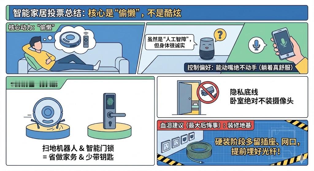 上周咱们通过投票聊了一整周的智能家居,几千条投票看下来,我发现个真理:大家搞智能家居的核心动力压根不是为了酷炫,纯粹就是为了偷懒。这数据太真实了,你们看,虽然绝大多数人都在吐槽现在的语音助手是“人工智障”,经常听不懂人话,但身体却很诚实,到了选控制方式的时候,还是最喜欢动嘴皮子,毕竟躺着确实比动手舒服。在所有设备里,扫地机器人和智能门锁是公认的神器,这说明大家的需求非常务实,谁能帮我干家务,谁能让我出门少带一把钥匙,谁就是亲爹。不过涉及到隐私,大家清醒得很,卧室绝对不装摄像头是底线。最后给准备装修的兄弟提个血泪建议,这也是投票里大家最后悔的事儿:硬装阶段千万多留几个插座和网口,提前把光纤或高质量的网线埋进去,这才是智能家居的地基,不然以后买再多高科技也是摆设。