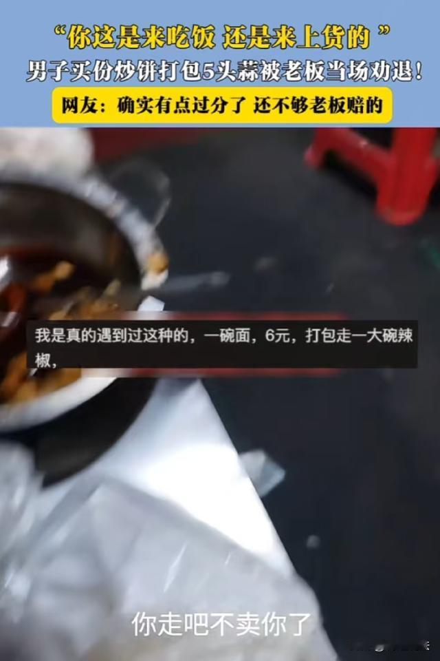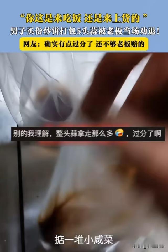 天津,男子去路边摊买了份炒饼,摊主递给他时发现男子在他店里打包了5头大蒜、半袋咸菜和一小碗辣椒油。摊主气笑了,将炒饼从男子手里抢了回来:兄弟,你这是吃饭来了还是进货来了?我不卖给你了! 据河南百姓315报道,强子开了一家卖快餐的小餐馆,店里卖的都是便宜管饱的快餐,利润不高。 强子的店开在路边,店里摆不下几张桌子,所以客人多的时候,强子就会在门口支上几张桌椅。 事发当天晚上,天已经黑了,一名男子在店门口喊,说要一份炒饼。 强子手脚麻利,几分钟后炒饼做好了,强子打包好后将袋子递给男子,招呼他说:兄弟你的炒饼好了。 谁知就在这时候,强子看到男子另一只手拎了几个塑料袋,强子立即将打包好的饭放在桌子上,叫住男子说:等会,你搁这,我看你掂的是啥? 强子拿过男子手里的塑料袋,打开一看,第一个袋子里装的是5头完整的大蒜,强子打开第二个袋子,里面是他店里自己腌制的小咸菜,男子装了小半袋,最后一个袋子里是用塑料小碗装着的一碗辣椒油。 强子顿时气笑了,他一份炒饼才几块钱,男子打包的东西,都快比炒饼还贵了。 强子推着男子走出店外,说:你走吧,你走吧,我不卖给你了。 强子将自己遇到的事发在了网上,有人说,既然店里提供了这些服务,别人打包就没问题,强子太小气了。 也有人说,如果男子当场吃,吃多少都没问题,但是一次性打包那么多头大蒜带走,就太说不过去了。 那么,从法律角度来分析,强子拒绝将炒饼卖给男子是否合法? 从法律层面来看,强子与男子之间原本形成了一个口头的买卖合同。 根据《民法典》规定,买卖合同是出卖人转移标的物的所有权于买受人,买受人支付价款的合同。 一般情况下,合同成立并生效后,双方都应按照约定履行义务。 但是,在这起事件中,男子的行为违反了交易公平性和诚实信用原则。 《民法典》规定,民事主体从事民事活动,应当遵循公平原则,合理确定各方的权利和义务;应当遵循诚信原则,秉持诚实,恪守承诺。 男子买了一份价格本来就不高的炒饼,却打包了价值接近甚至可能超过炒饼本身价格的大蒜、咸菜和辣椒油,这种行为显然不符合公平和诚实信用原则。 强子作为摊主,在发现男子的不当行为后,为了维护自身的合法权益和交易的公平性,有权拒绝继续履行合同。 从这个角度看,强子拒绝卖给男子炒饼的行为具有一定合法性的。 男子这种占小便宜的打包行为应该如何认定? 虽然强子的餐馆提供辣椒油、咸菜、大蒜供顾客搭配食物食用,但并不意味着顾客可以无限制地进行打包。 男子的行为实际上是单方面改变了交易的内容,违反了潜在的交易规则,超出了正常的交易预期。 《民法典》规定,得利人没有法律根据取得不当利益的,受损失的人可以请求得利人返还取得的利益。 男子打包的大蒜、咸菜和辣椒油数量超出了正常搭配一份炒饼的合理范围,且这些物品是强子经营成本的一部分,男子的这种行为使得强子遭受了额外的经济损失,而男子自身获得了不当利益。 因此,强子有权要求男子返还超出合理范围打包的物品。 最后,占便宜要有度,人穷不可怕,但一定不能心穷。