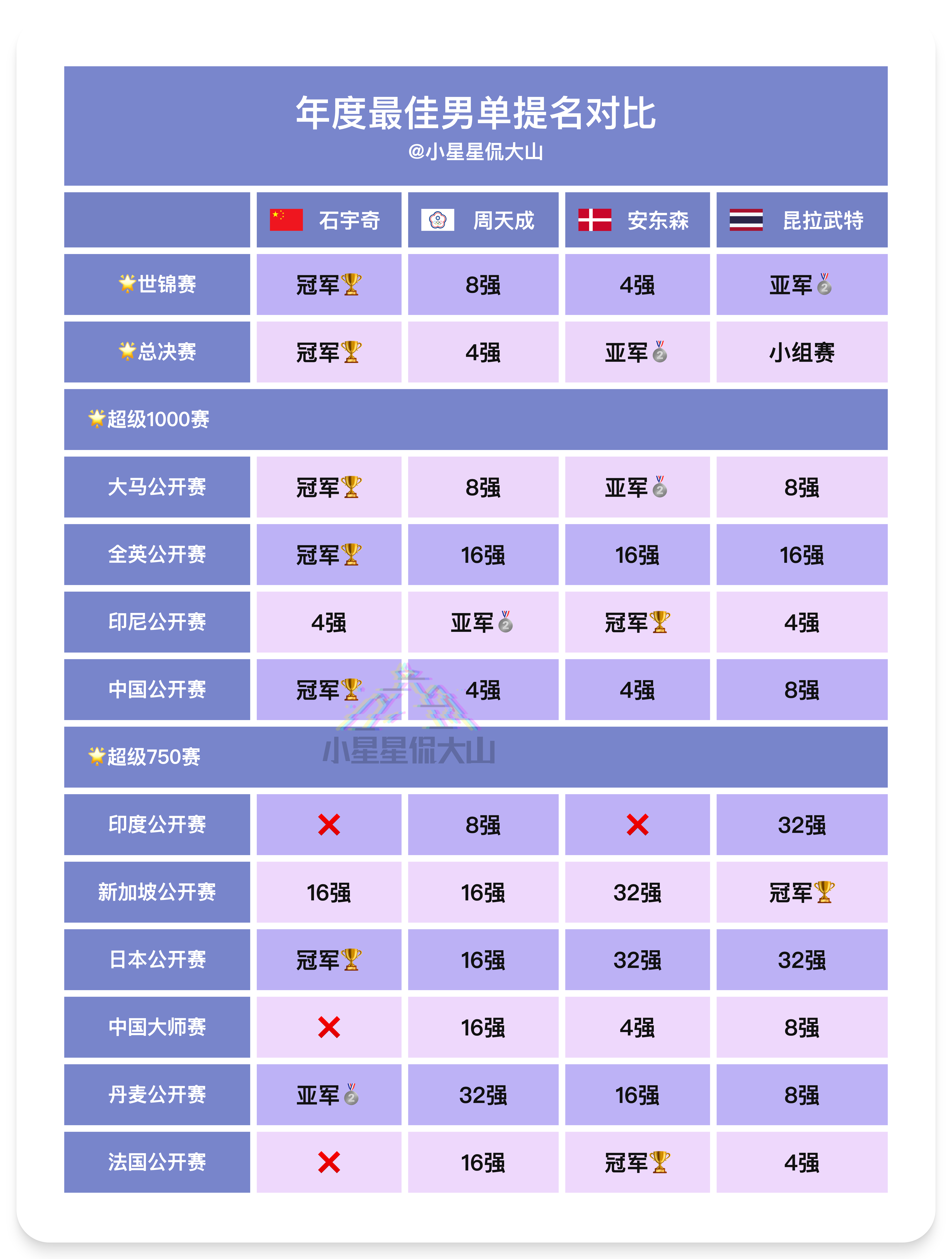 年度最佳男单球员提名成绩羽联总决赛颁奖典礼 【2025年度核心奖项最终得分由两部分构成】(1)过去52周内累积的世界排名积分(2)由五人专家小组在每站指定赛事(包括2024年世界羽联世界巡回赛总决赛、所有超级1000和超级750赛事及2025年道达尔能源世界羽联世界羽毛球锦标赛)后进行的投票评分🌟2024年年终总决赛与2025年世锦赛采用双倍计分制🌟