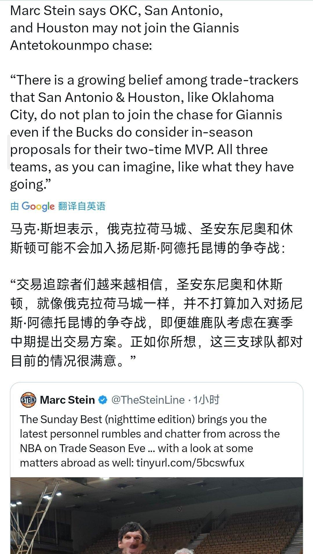 Stein表示,马刺,雷霆,火箭对目前阵容满意,预计不会加入字母哥争夺少了仨竞争对手是不是没什么对手了