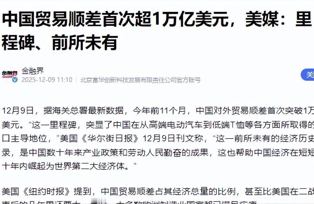 中国成为人类历史上首个顺差超万亿的国家,为什么大家都没感觉? 2025年12月,国家海关总署公布了一组足以载入经济史的数字:前11个月我国贸易顺差突破1.08万亿美元,这是人类历史上首次有国家达成顺差超万亿的成就。 连《纽约时报》都专门发文标注这一“里程碑式突破”,可国内网友的反应却相当平淡,热搜都没待多久,不少人甚至疑惑“这数很大吗?跟我有关系吗?” 1.08万亿美元顺差到底有多“吓人”。换算成咱们熟悉的人民币,按当前汇率差不多是8万亿出头。 这是什么概念?相当于全国每人能分到近6000块钱,比很多三四线城市的人均月工资还高;要是用来盖高铁,以每公里造价1.5亿元算,能修出5万多公里,差不多能绕地球一圈还多。 这是“顺差”,意味着咱们卖出去的东西比买进来的多赚了这么多,而且是在全球经济低迷、不少国家搞贸易保护的大背景下实现的——要知道美国对华加征关税的影响还在,可咱们对东盟、非洲的出口增速分别达到13.7%和26.3%,硬生生靠多元化市场补上了缺口。 可能有人觉得“不就是卖东西赚了钱吗”,但这万亿顺差的含金量,早已不是当年“卖袜子换飞机”的水平了。 以前咱们顺差多靠劳动密集型产品,现在撑起半边天的是电动汽车、锂电池、太阳能电池这些“新三样”,前11个月光汽车出口就增长了17.6%,集成电路出口增速更是高达25.6%。 这背后是咱们独有的优势:全世界只有中国拥有联合国产业分类里的全部工业门类,在珠三角,一个新产品从打样到量产可能只需要几天,这种供应链效率让全球商家都离不开。 说白了,这万亿顺差不是“拼汗水”换来的,而是全球市场用订单给中国制造业的“实力投票”。 那为啥这么牛的成就,大家却没感觉?核心还是这数字太“宏大”,离日常感受太远。 咱们每天关心的是菜价涨没涨、工资发多少、通勤顺不顺,万亿顺差这种宏观经济数据,不会直接变成口袋里的钱,也不会立刻改变生活细节。 而且这些年中国外贸的惊喜太多了,从成为世界工厂到连续多年稳居货物贸易第一大国,大家对“中国造卖全球”已经习以为常,就像看惯了奥运冠军拿金牌,反而忘了这背后是多少实力的积累。 但千万别因为没感觉,就低估这万亿顺差的意义。 对国家来说,这是抵御外部风险的“压舱石”,在全球经济不确定的当下,稳定的外贸收入能给就业、产业升级提供坚实支撑。 对咱们普通人来说,它其实藏在生活的方方面面:出口带动的产业链能提供更多工作岗位,进口原材料价格下降还能间接拉低国内相关产品成本。 对世界而言,中国的高效产能是“稳定器”,从平价家电到新能源装备,中国制造既提高了全球民众的购买力,也为绿色转型提供了可负担的选择。 这不是零和博弈的“掠夺”,咱们在服务贸易、农产品等领域长期是逆差,大量进口也带动了其他国家的经济发展,形成了互利共赢的格局。 万亿顺差的平淡反响,恰恰说明中国经济的底气越来越足。当“历史性突破”变成“常规操作”,当“世界工厂”升级为“创新高地”,这种“没感觉”其实是最踏实的安全感。 它证明中国经济早已是一片大海,风浪再大也能稳得住,而这份稳定,正是我们安稳生活的最强后盾。