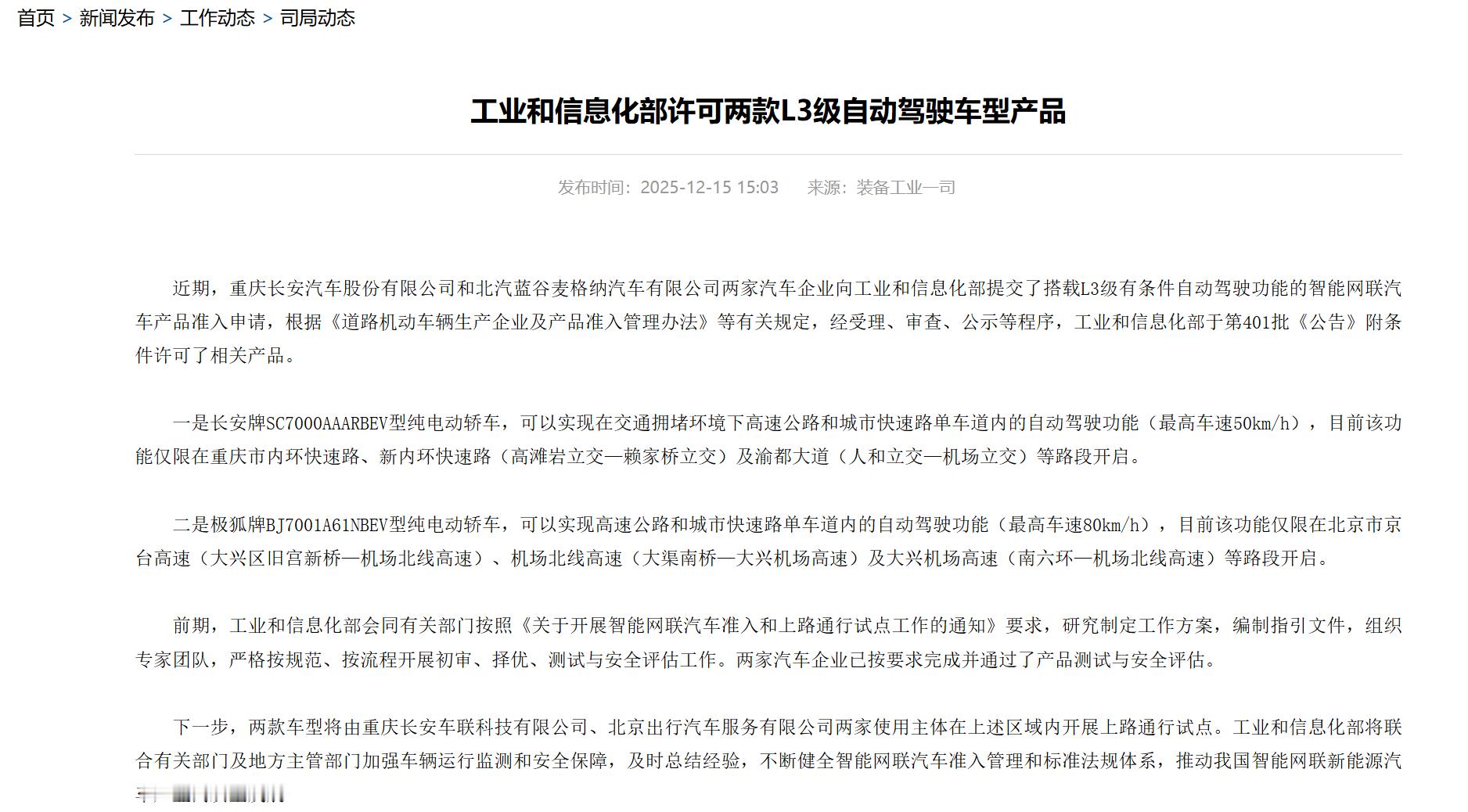 我国首批L3自动驾驶车型获准入许可奇怪,为何没有公布车型和企业名称。央视新闻没有写企业和车型,但是工信部的官网有公告:一是长安牌SC7000AAARBEV型纯电动轿车,可以实现在交通拥堵环境下高速公路和城市快速路单车道内的自动驾驶功能(最高车速50km/h),目前该功能仅限在重庆市内环快速路、新内环快速路(高滩岩立交—赖家桥立交)及渝都大道(人和立交—机场立交)等路段开启。二是极狐牌BJ7001A61NBEV型纯电动轿车,可以实现高速公路和城市快速路单车道内的自动驾驶功能(最高车速80km/h),目前该功能仅限在北京市京台高速(大兴区旧宫新桥—机场北线高速)、机场北线高速(大渠南桥—大兴机场高速)及大兴机场高速(南六环—机场北线高速)等路段开启。