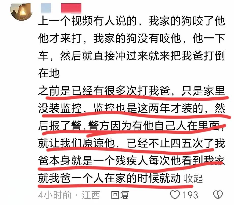 12月12日,冮西一位有残疾的大叔,坐在门口剥橘子吃。忽然听到一阵狗的狂吠,引起了大叔的注意。只见四、五条狗都往后退,朝着一个方向猛叫。 大叔顺着狗叫的方向望去,一个黑衣男子朝他走来,是他的邻居。大叔起身迎了上去,想问有什么事。谁知道,还没等话说完,男子一拳把他打倒在地上,转身离开。 大叔后脑勺着地,昏迷过去,地上流了不少血。狗狗也被这场面吓住了,躲的远远的。 几分钟后,男子折返回来,后面跟着拄杖的颤巍巍的老太太。男子见大叔情况不妙,拿出手机打120。老太太在一旁训斥男子。大叔送到医院检查,诊断脑出血,下了病危通知书。 邻里邻居低头不见抬头见,本应和睦相处,遇事也好相互帮助,有问题可以协商解决。男子可倒好,想用拳头解决问题,结果出了大麻烦。 男子坐门口吃橘子被黑衣男打倒昏迷邻里邻居的琐事