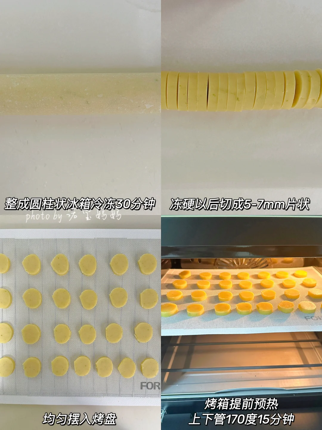 4️⃣整形成圆柱形,放冰箱冷冻 30分钟定型,拿出切块放入烤盘
