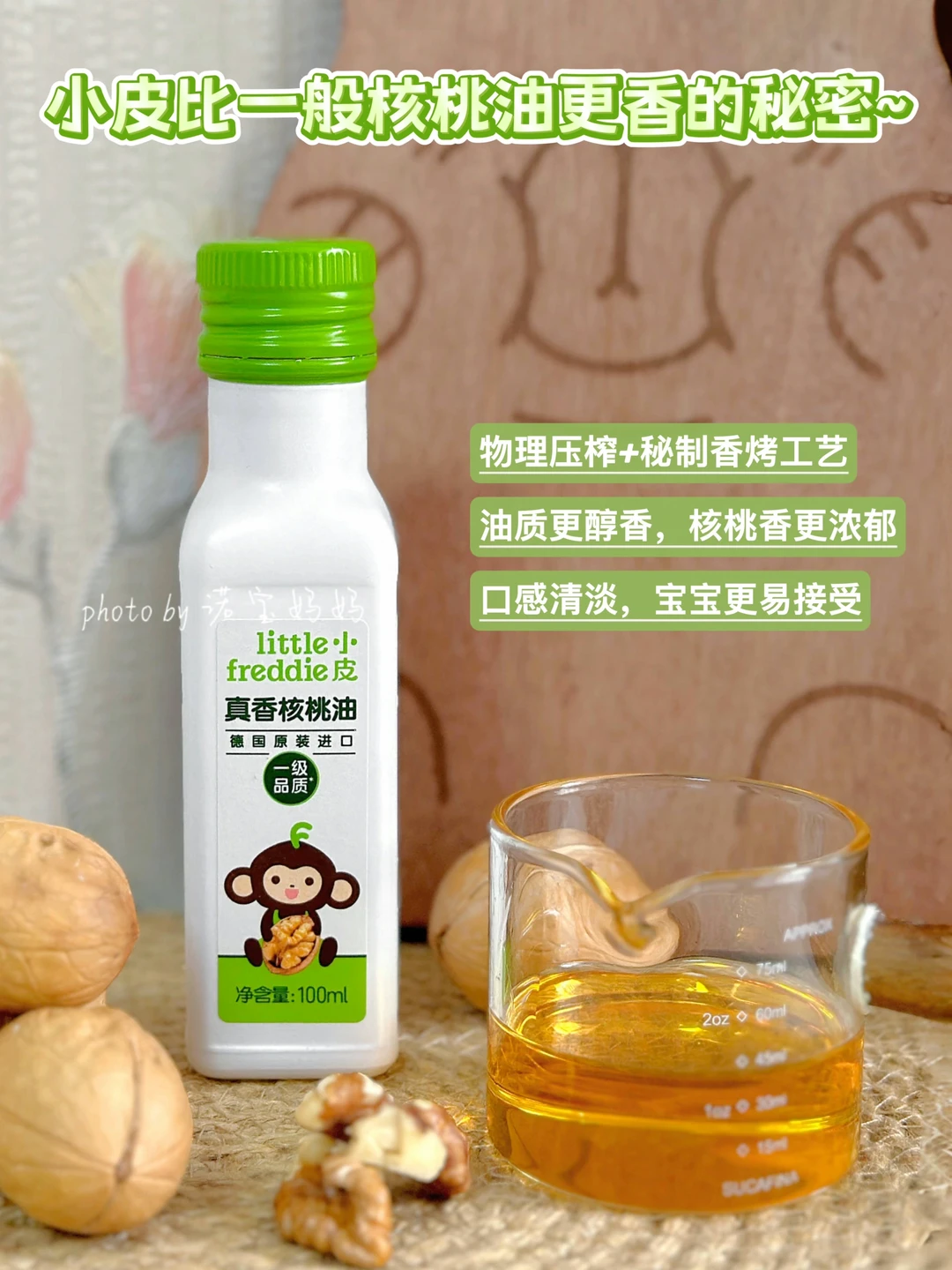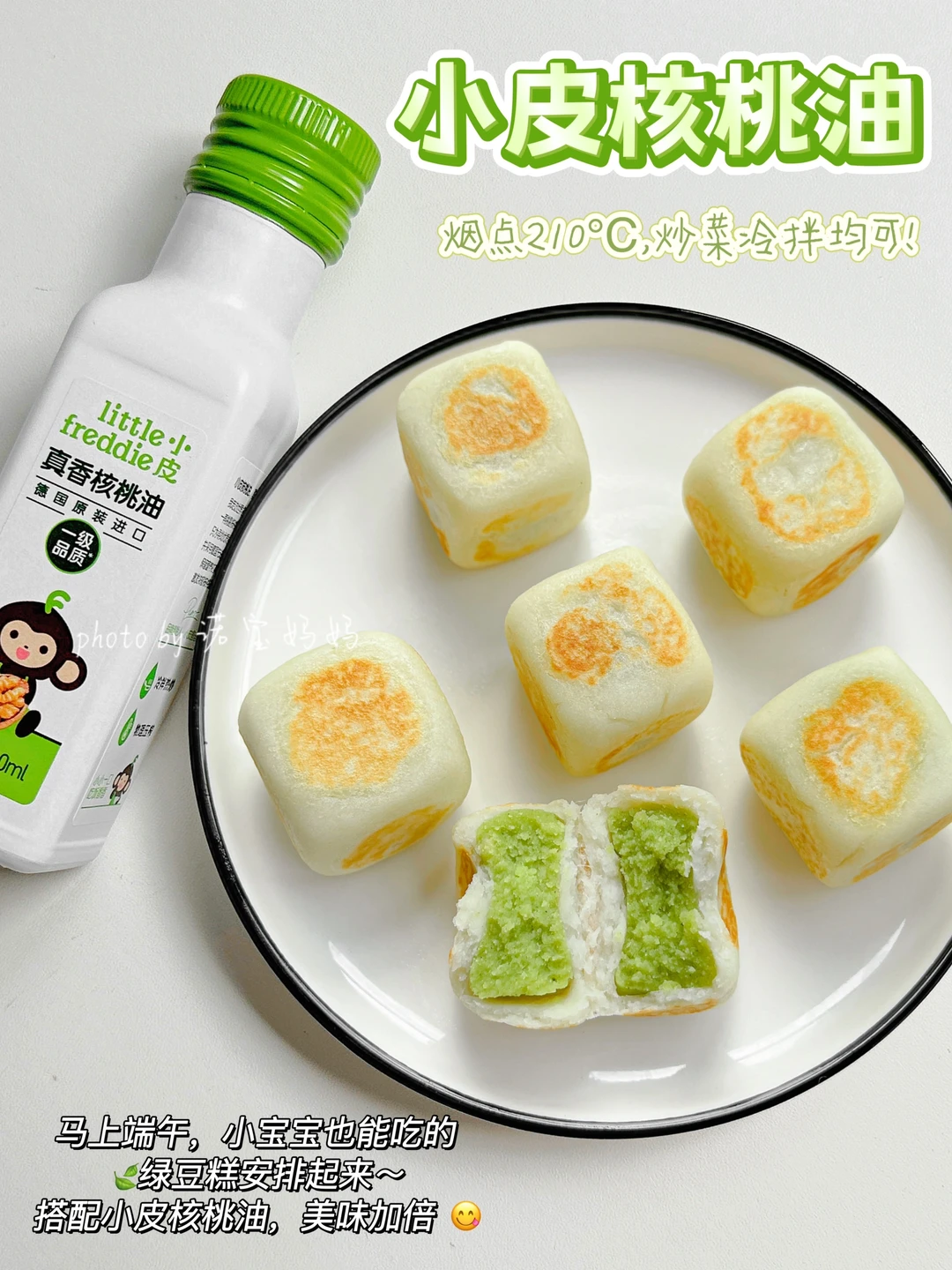 平时做辅食,我用的最多的就是小皮核桃油!从6月龄开始,我就开始给宝宝加小皮核桃油了,淡淡的清香她很喜欢,再其次小皮做辅食确实方便,因为烟点比较高(有210℃),可炒菜也可凉拌,拌米粉拌面条炒青菜,小皮几乎可以涵盖日常辅食的各种烹饪方式,我的厨艺终于不再被油而限制,每次都担心高温炒起来万一破环营养可咋办。