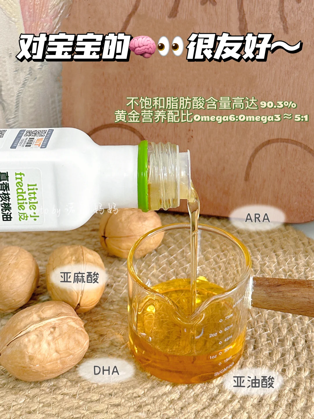 不止是方便做辅食,小皮核桃油的不饱和脂肪酸含量高达90.3%,这种符合黄金营养配比的核桃油用来添加做辅食更方便宝宝吸收,看着宝宝大口大口的吃饭,当妈的心里暗喜:这吸收的可是满满的营养!