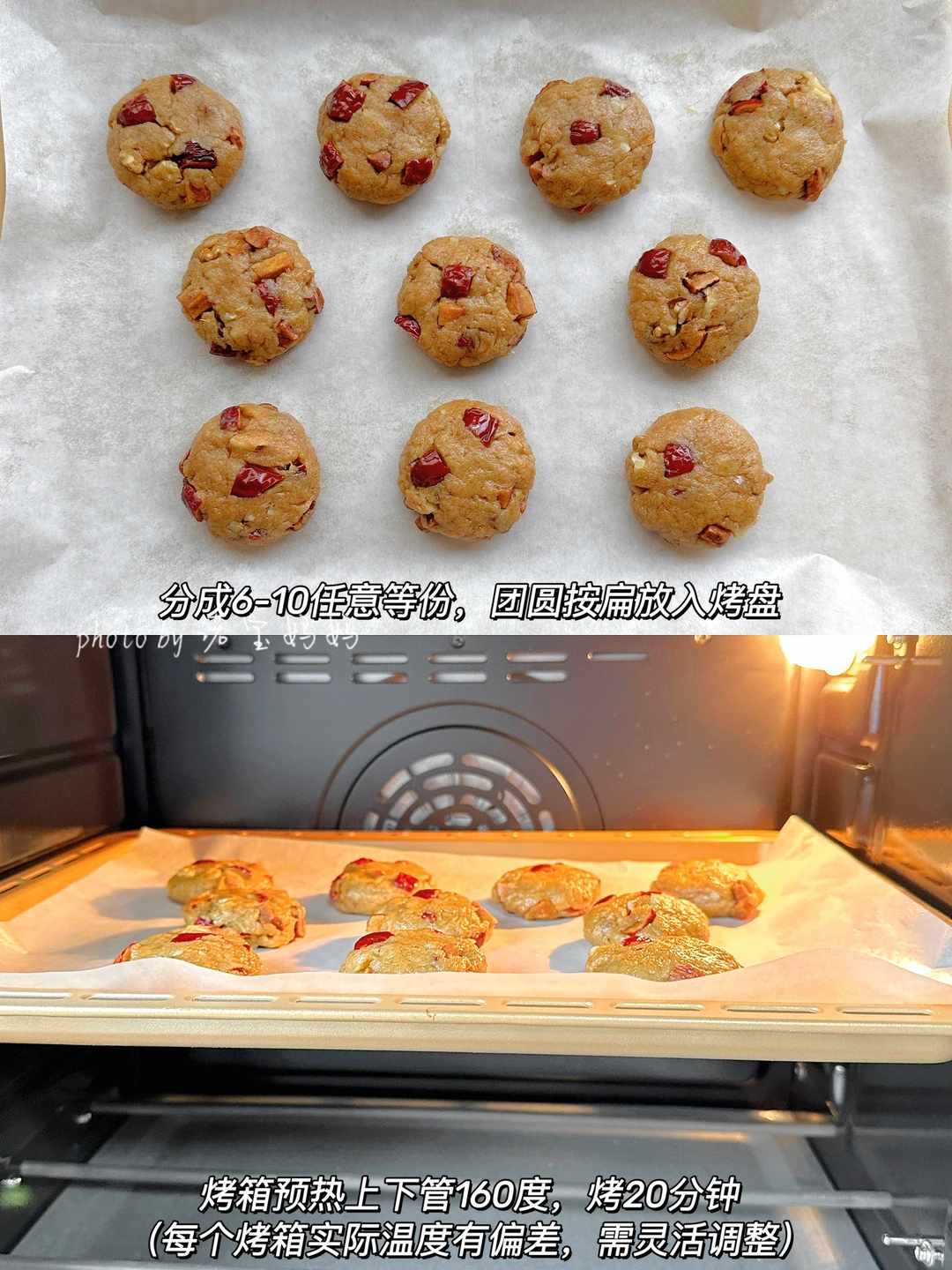 2️⃣筛入全麦粉、泡打粉翻拌成团,加入切碎的核桃、红枣翻拌成团,分成6-10等份(根据自己需要任意),团圆按扁放入烤盘