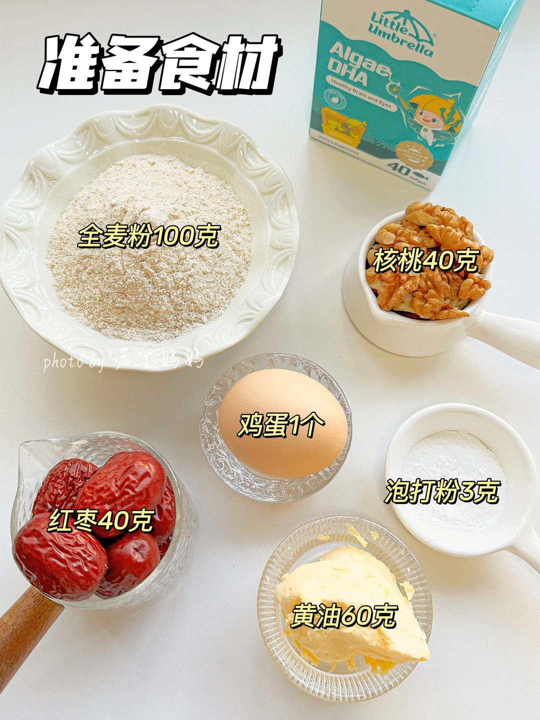 全麦粉100克,核桃40克,红枣40克,泡打粉3克,黄油60克,鸡蛋1个