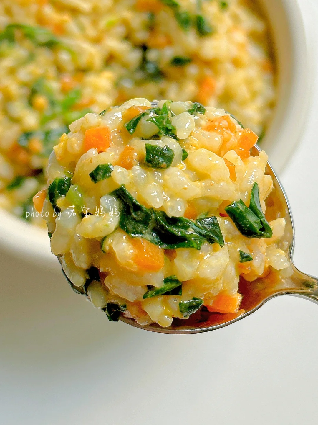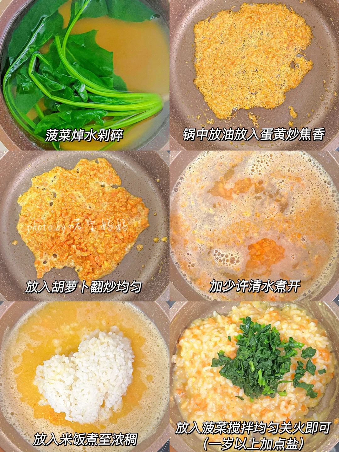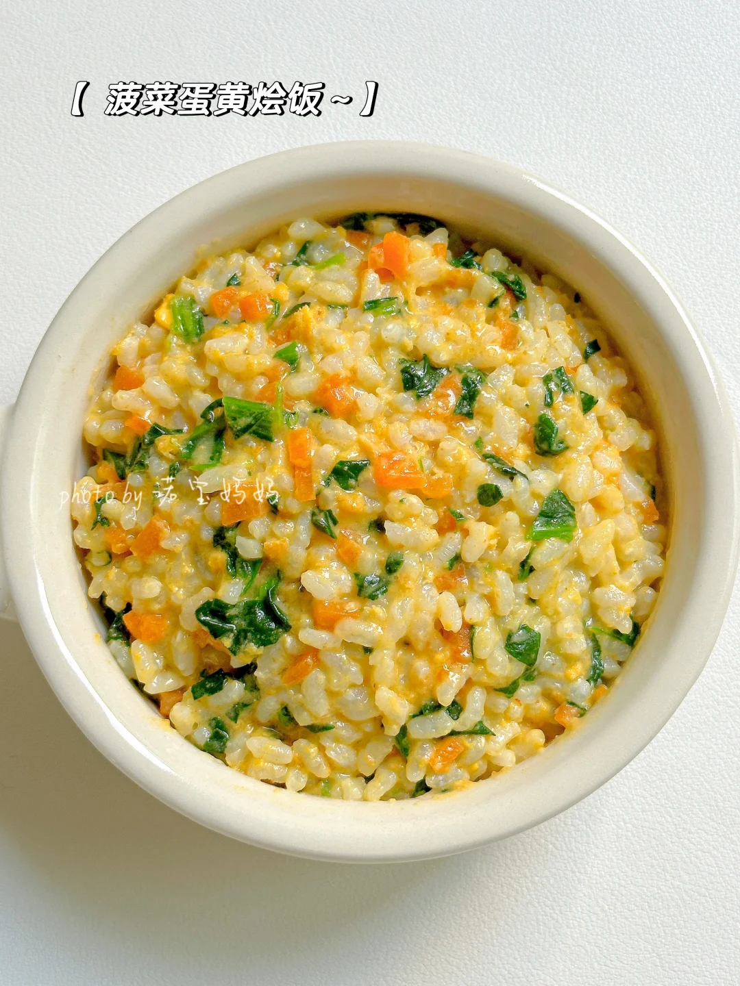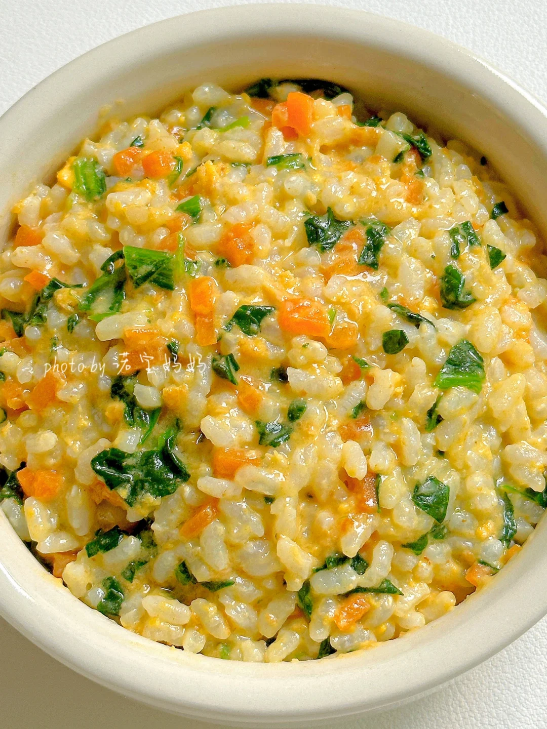过年几天吃的太荤怕宝宝消化不好?来试试这个菠菜蛋黄烩饭吧!营养软糯,简单好做,容易消化~姐妹们,快来试试吧? 🛒食材: 米饭,菠菜,胡萝卜,蛋黄(水煮蛋取蛋黄) ~~~~~~~~~~ 👩🍳做法: 1⃣菠菜焯水剁碎,蛋黄压碎 2⃣油锅炒香蛋黄,放入胡萝卜翻炒均匀,加少许清水煮开 3⃣加入米饭煮至浓稠,放入菠菜和少许盐即可关火