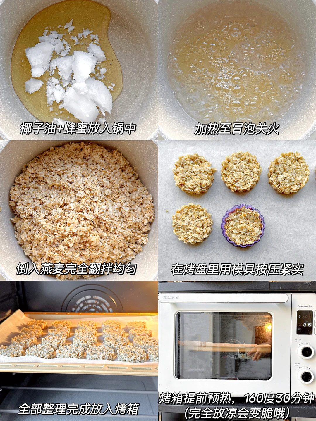 马上过年了🧨给大家分享一款临时抱佛脚的新年小零食!因为它不仅酥酥脆脆巨好吃,关键做法简单快手!只需三种食材,搅一搅就能成功~不输外面卖的燕麦棒!姐妹们快来试试!保准全家都爱吃~ 🛒食材: 即食燕麦200克,蜂蜜60克,椰子油50克 ~~~~~~~~~~~~~ 👩🍳做法: 1️⃣椰子油+蜂蜜放入锅中加热至冒泡,倒入燕麦片翻拌均匀 2️⃣烤盘上放上模具,放入燕麦片,按压紧实 3️⃣烤箱提前预热160度烤30分钟,烤完后完全放凉变酥脆以后(大约 40分钟)密封保存