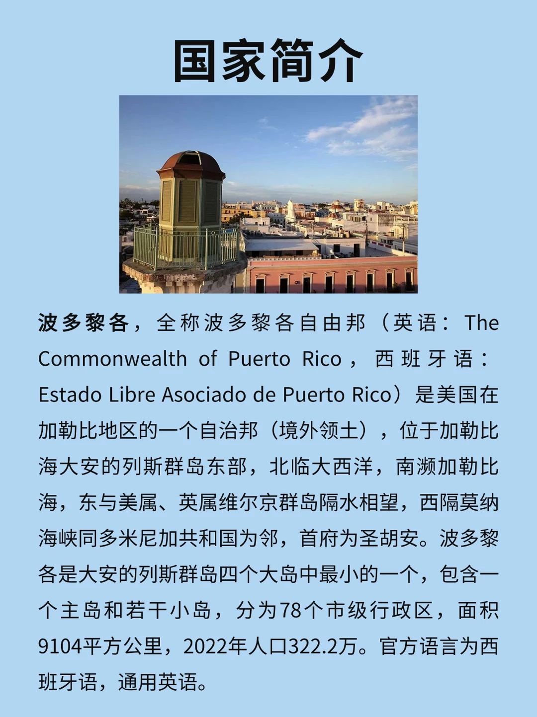 波多黎各是大安的列斯群岛四个大岛中最小的一个,包含一个主岛和若干小岛,分为78个市级行政区,面积9104平方公里,2022年人口322.2万。官方语言为西班牙语,通用英语。