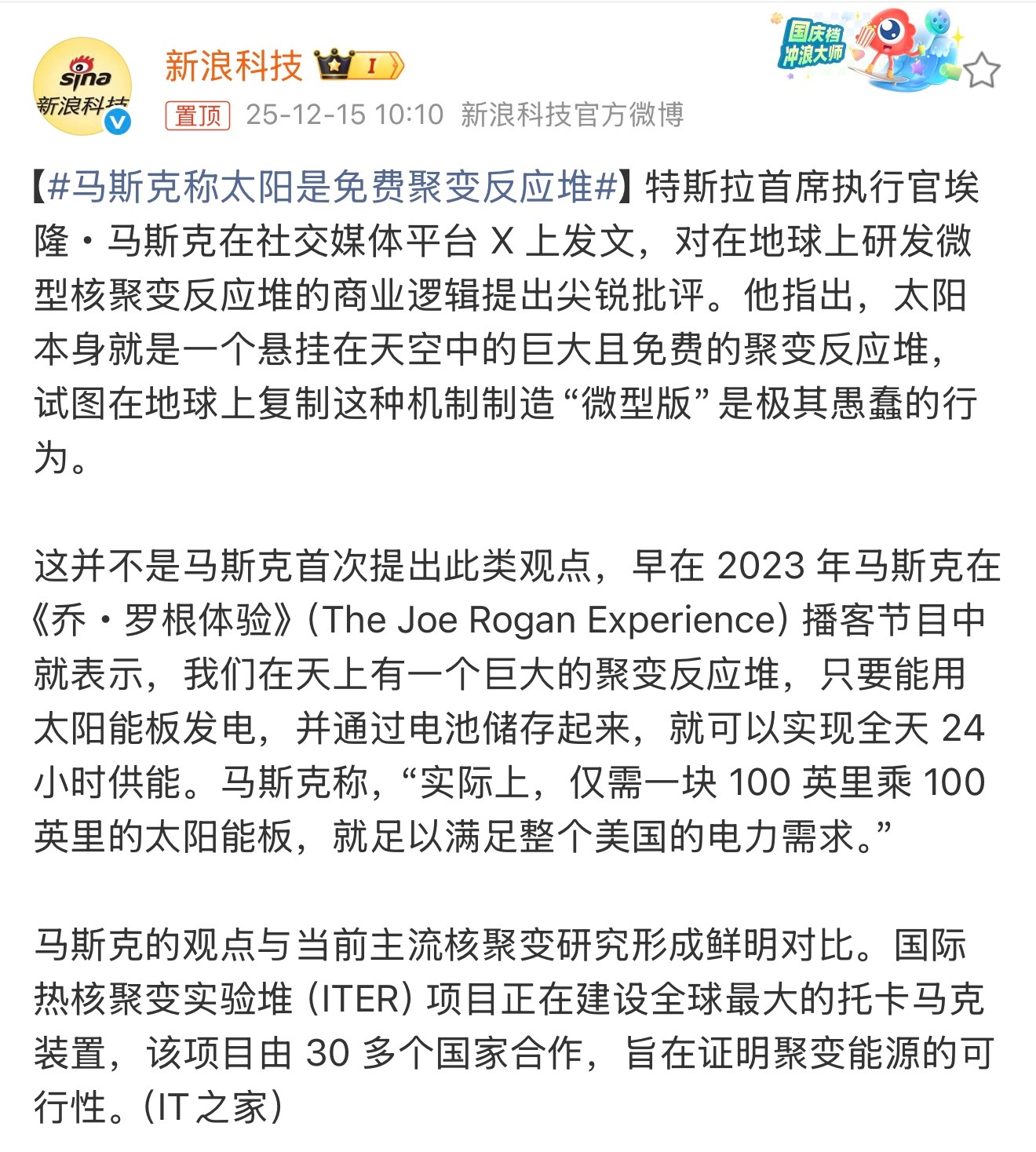 马斯克称太阳是免费聚变反应堆几十亿年稳定供能,还完全免费,但真要用好它,成本可一点不低。光伏板、储能系统、电网改造,哪个不是烧钱的技术活?而且这“反应堆”不受控制,阴雨天就得歇菜。不得不佩服马斯克的脑洞啊,但没办法,理想很丰满现实很骨感。