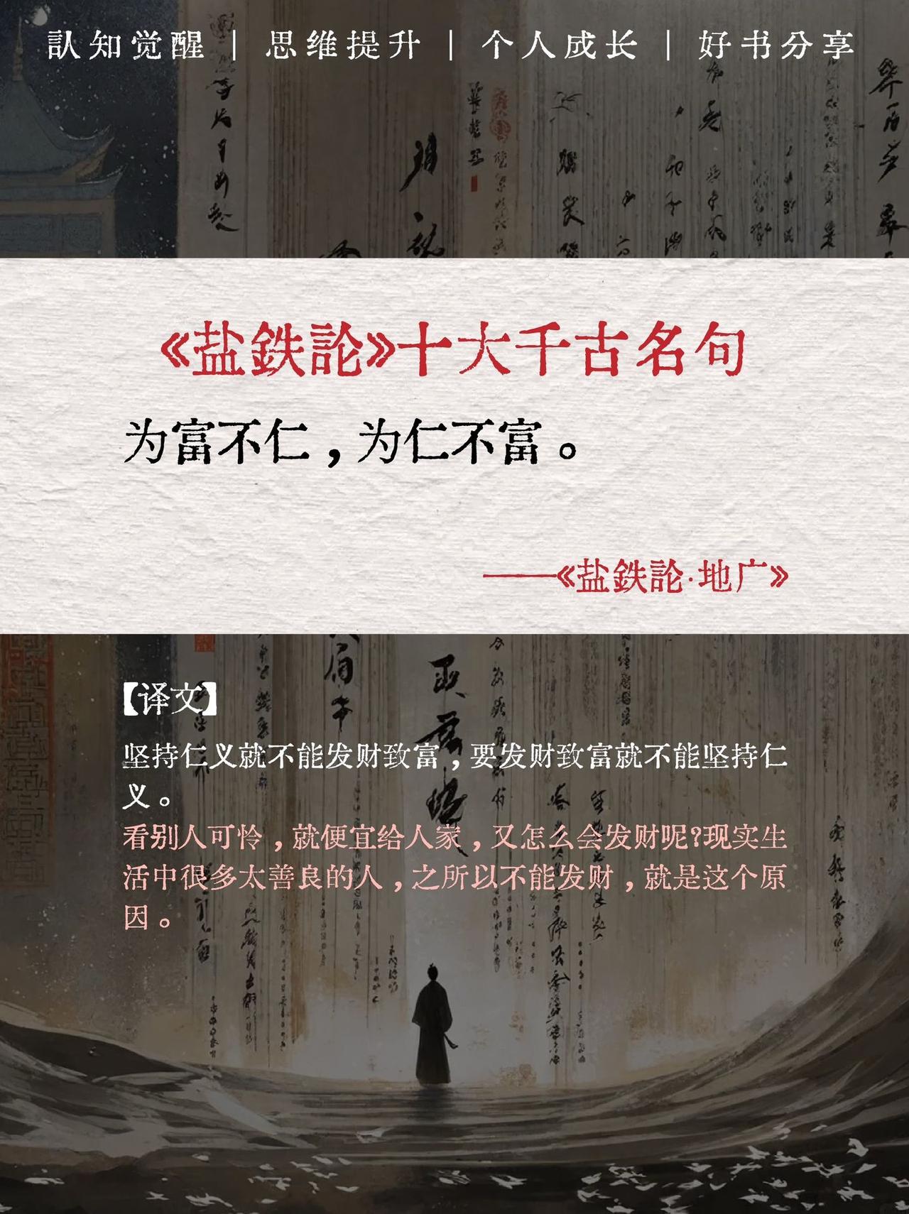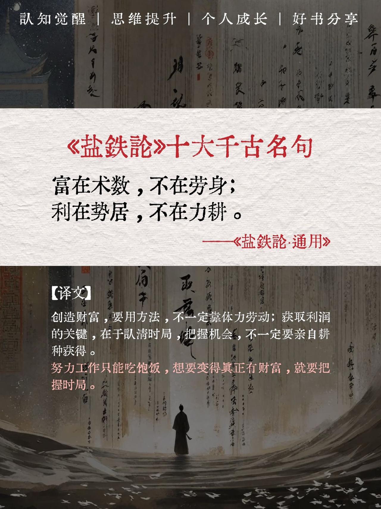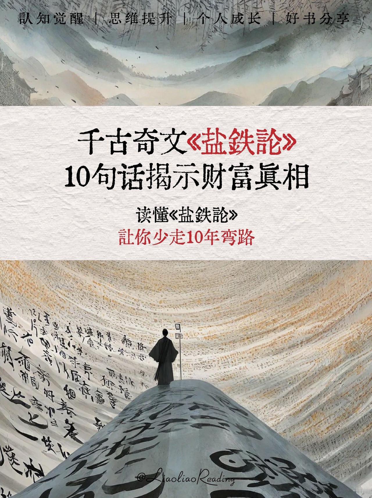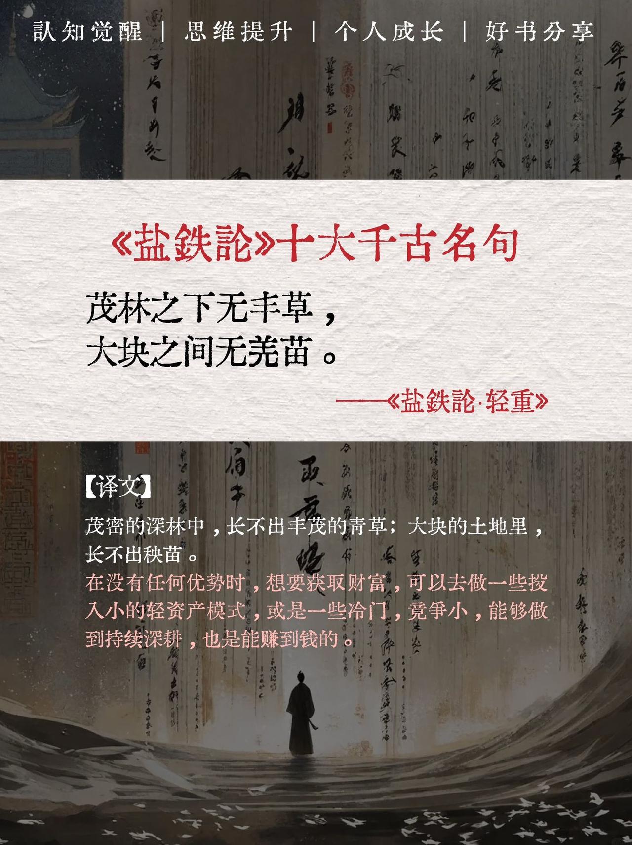 《盐铁论》这10句话,揭示了财富真相,读懂这些话,可以让你少走10年弯路。看完之后,周少不得不说总结得真精辟到位。比如这句话,茂林之下无风草,大块之间无美苗。意思是茂密的深林中,长不出丰茂的青草;大块的土地里,长不出秧苗。在没有任何优势时,想要获取财富,可以去做一些投入小的轻资产模式,或是一些冷门,竞争小,能够做到持续深耕,也是能赚到钱的。这些话,周少建议大家保存下来,没事的时候,多读一读,多品一品,真的能让你少走很多弯路。#寻美三湘##长沙新朋友# 正版盐铁论经典名著全本全注丛书窥探汉代政治史经济史的真相书
