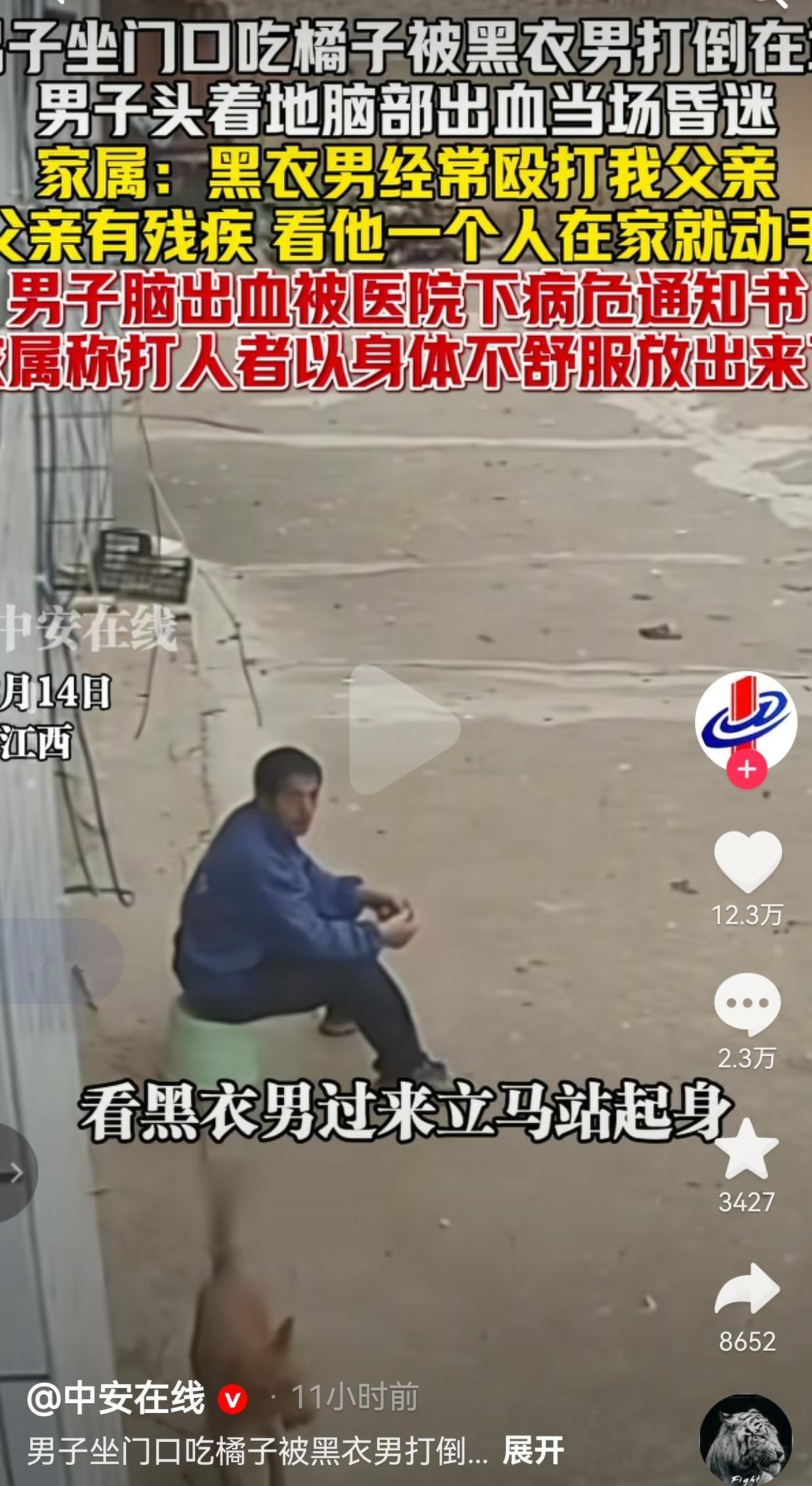 太可恨了!近日,江西一老人坐在自家门前吃橘子,听到狗叫声老人知道有人来了,老人向远处一看,看到一黑衣男子走了过来老人赶紧站起身来。 慢慢地向男子走近,谁知道什么原因,黑衣男子直接打了老人一拳。 视频中看得出来,这一拳应该很重,因为,就是这一拳,老人就这样直勾勾地后脑勺着地,重重地摔在了地上,一点缓冲的点都没有。 黑衣男子看老人摔倒在地,没有第一时间拨打电话,竟然直接离开了案发现场。过了一会儿,大约4分钟,黑衣男子再次回到现场,老人依旧躺在地上,没有起来。 黑衣男子将老人暴力拽起,看到地上有一滩血迹,黑衣男子意识到不对劲,这才从兜里掏出手机拨打电话叫救护车。 这个时候,一位老太太慢慢地走了过来,看到男子拨打120,老太太试图阻止,不想让男子打电话。慢慢地,受伤老人意识清醒了过来,挣扎地坐了起来,老人摸一摸自己的后脑勺,手上都是血迹。 后来,受伤老人被送到医院抢救不幸的是,老人被医生诊断为脑出血,生命危在旦夕,被医院多次下达病危通知书。 令人寒心的是,据老人的女儿讲述,黑衣男子经常殴打父亲,父亲有残疾,看他一个人在家才敢动手施暴。 据家属透露案发后,虽然施暴者被抓进了派出所,但是,却以身体不舒服为由放了出来。 有网友评论道,人怎么可以这么坏呢?跟人家无冤无仇,为什么要下狠手呢?你年轻力壮的,下手没有轻重,这一下真的要了老人的命了! 视频中,老人看到黑衣男子走来时,他还本能地起身,可这份小心翼翼,终究没躲过迎面而来的暴力。一记重击,他头着地、脑出血,当场昏迷,医院的病危通知书成了家属手里最沉重的纸。 更让人心寒的是,家属说这不是第一次,打人者专挑老人独自在家时动手,而施暴后竟还以“身体不适”被放出。残疾的身躯扛不住一次次欺凌,弱势的处境成了被肆意伤害的理由,这不仅是一次个体的暴力事件,更是对弱者生存底线的践踏。 我们总说“法不容情,更不容暴”,可当暴力落在无力反抗的人身上,当施暴者的嚣张没有被及时遏制,公平与正义的天平,又该如何向弱者倾斜? 希望这场伤害能有一个公正的结果,也希望每一个身处弱势的人,都能被法律护在身后,不必在恐惧中生活。 大家觉得呢?欢迎大家评论区讨论留言。