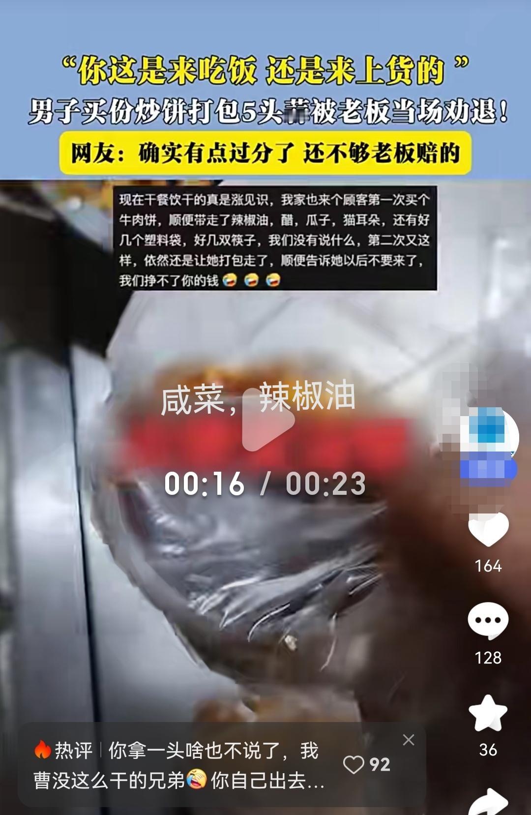 【炒饼没买成,顺走5头蒜把老板整破防了】 昨天有个事儿挺逗:一哥们买炒饼,顺手打包了5头免费大蒜,一份咸菜,一盒辣椒油,结果老板直接“劝退”不卖了!网友算账:现在大蒜5块多一斤,5头起码值10块钱,炒饼才赚几块?这不是来吃饭,是来“进货”的啊! 有人觉得老板小气:“免费的不就是让拿吗?”但仔细想:小店利薄,贪小便宜也得有个度。要是人人都这么“批发式”捎蒜,老板不如改行卖菜算了。 我倒觉得,这事儿无关对错,倒是暴露了人情社会的边界感——商家愿意给方便,顾客也得懂分寸。毕竟,谁也不想因为几头蒜,丢了吃炒饼的资格吧? 社会百态 生活观察 生意经