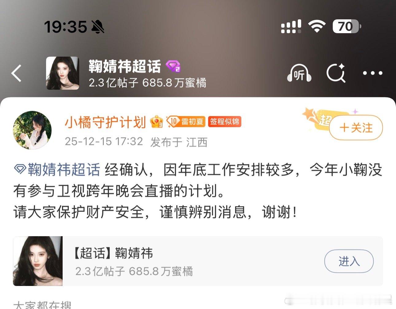 鞠婧祎不参加各大卫视跨年 鞠婧祎后援会称鞠婧祎因行程较忙,没有参加跨年活动的行程。