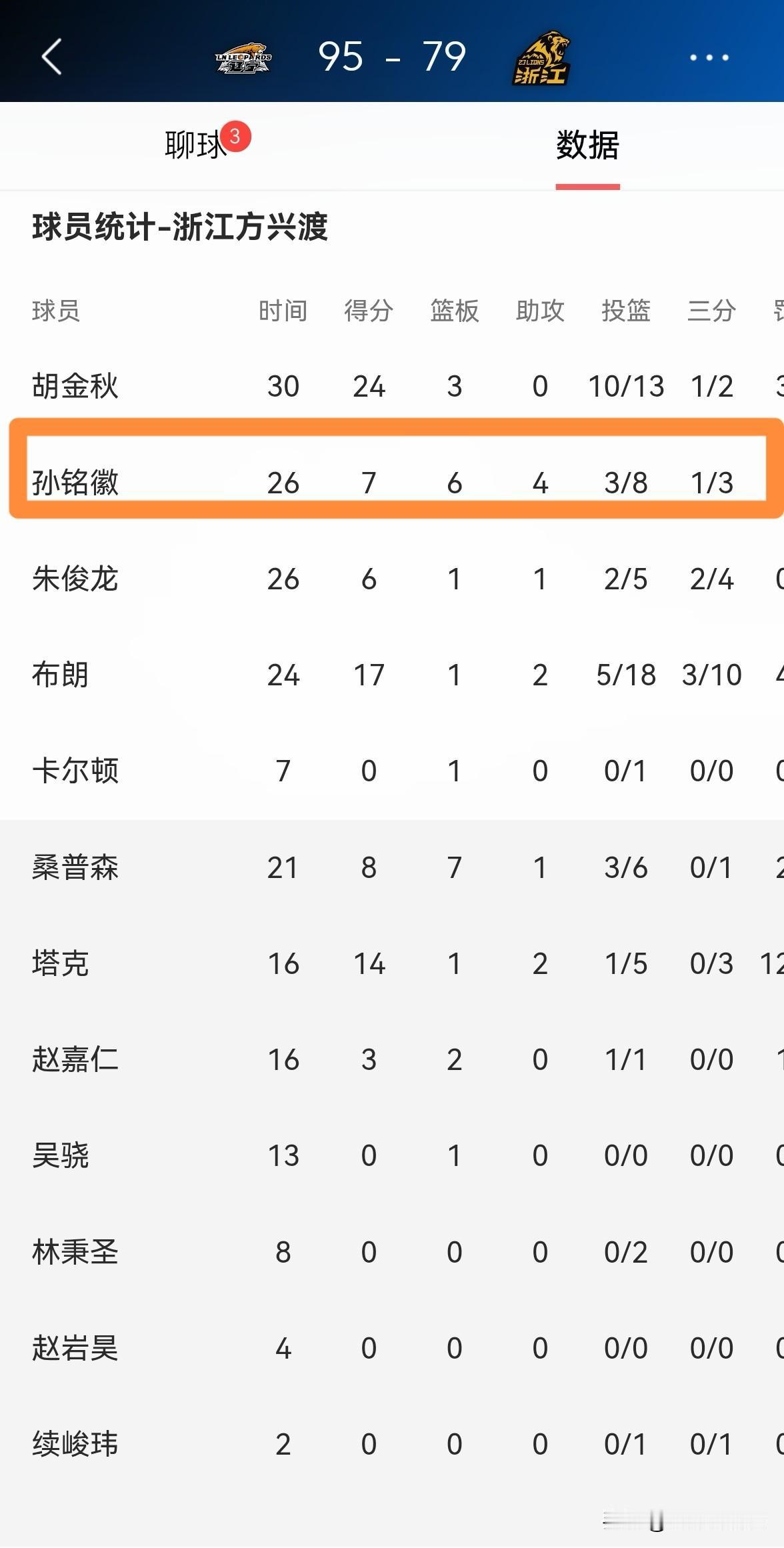 浙江方兴渡当家控卫孙铭徽真是难堪大用!在今天浙江方兴渡客场以79:95惨败于辽宁