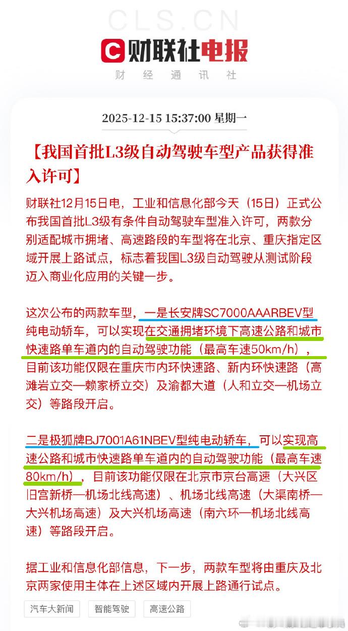 刚有人问我进入L3发展阶段以后,会不会也出现象L2时对能力胡乱宣传的现象?可以放心,应该不会再有这种乱局了,几个月前我就说过:据我所知L3不会是一刀切,具体到不同的智驾系统和感知配置,会有严格的测试审核,然后划定不同的运行条件、也就是能保证安全有效运行的具体条件范围。比如有的在雨雪雾天气下不能使用、有的白天可以晚上不能使用等等,超出这个运行条件范围就无法开启L3自动驾驶、正在运行的会在提示接管后退出或是退到L2。而从今天发布的公告来看,L3时车辆的最高时速大概也会有区分限制。
