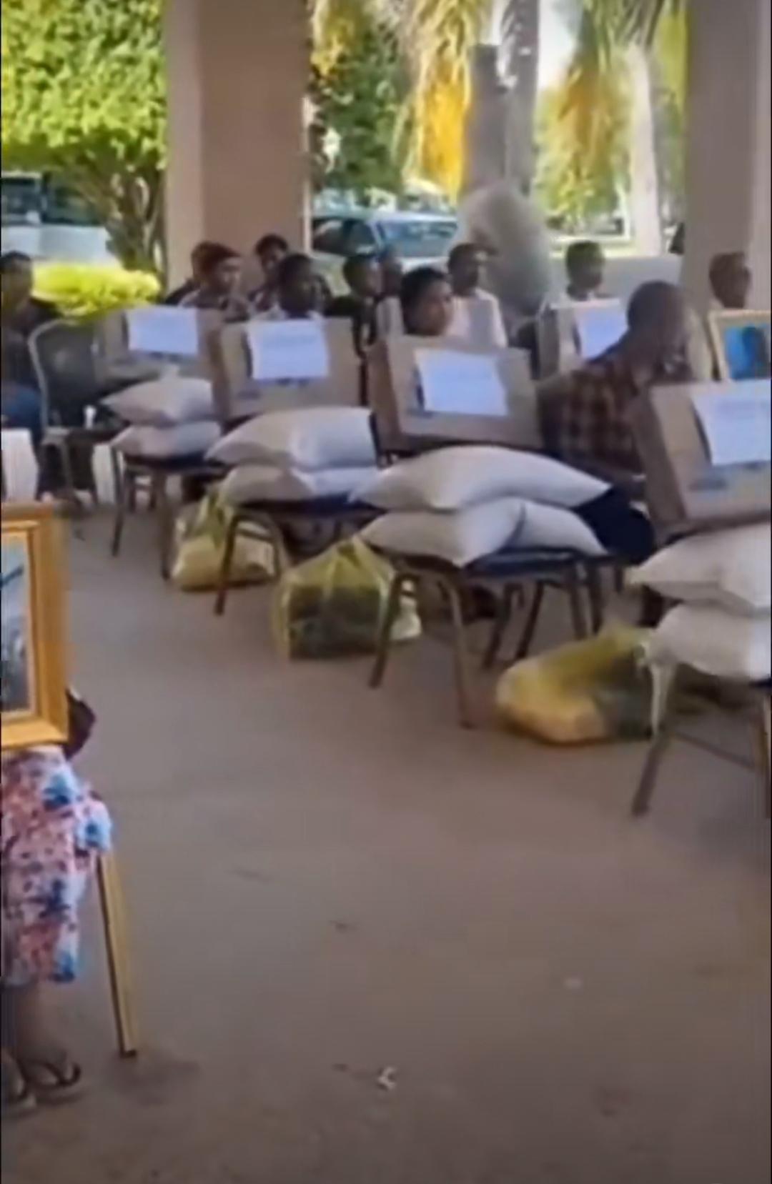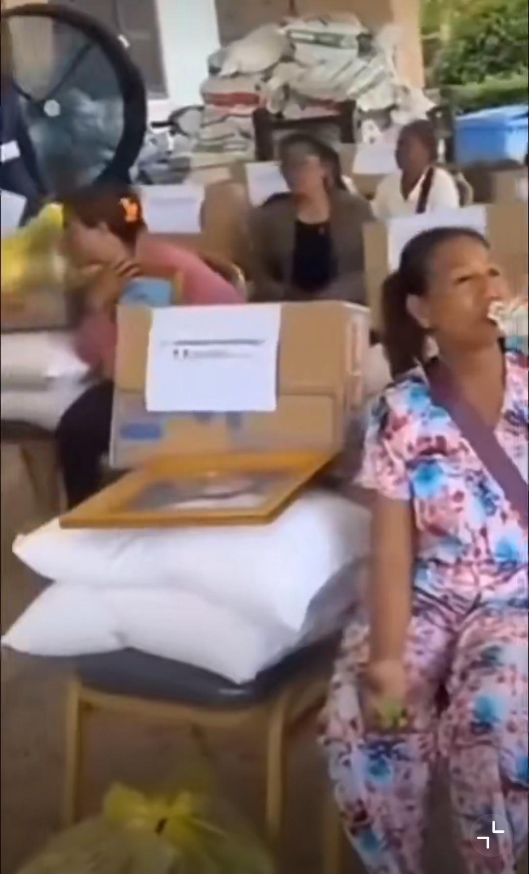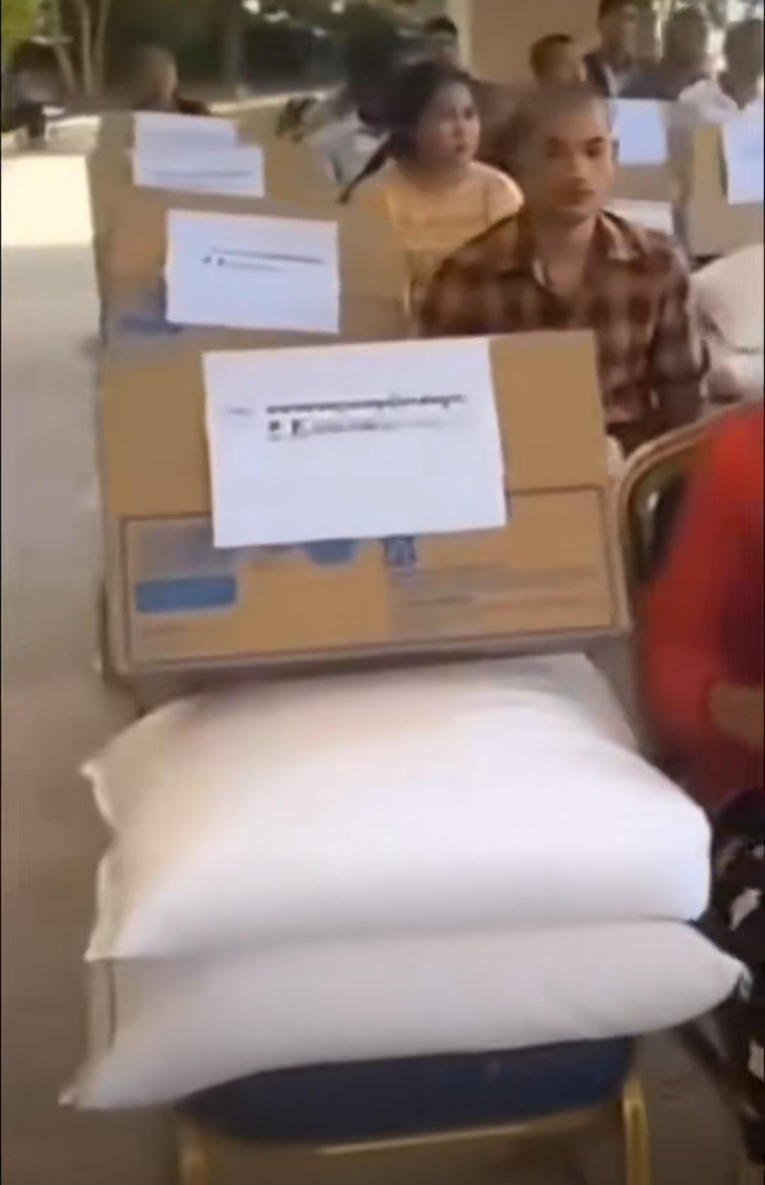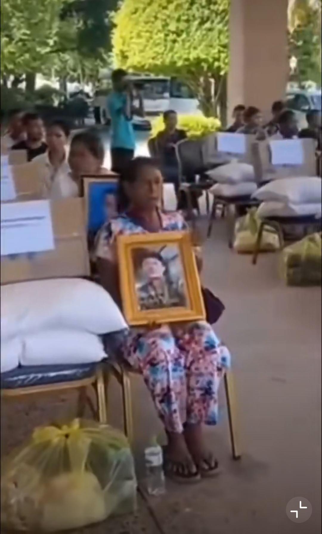 柬泰冲突持续,阵亡的柬埔寨士兵家属领两袋大米,一箱泡面,10瓶鱼露。 四列,每列
