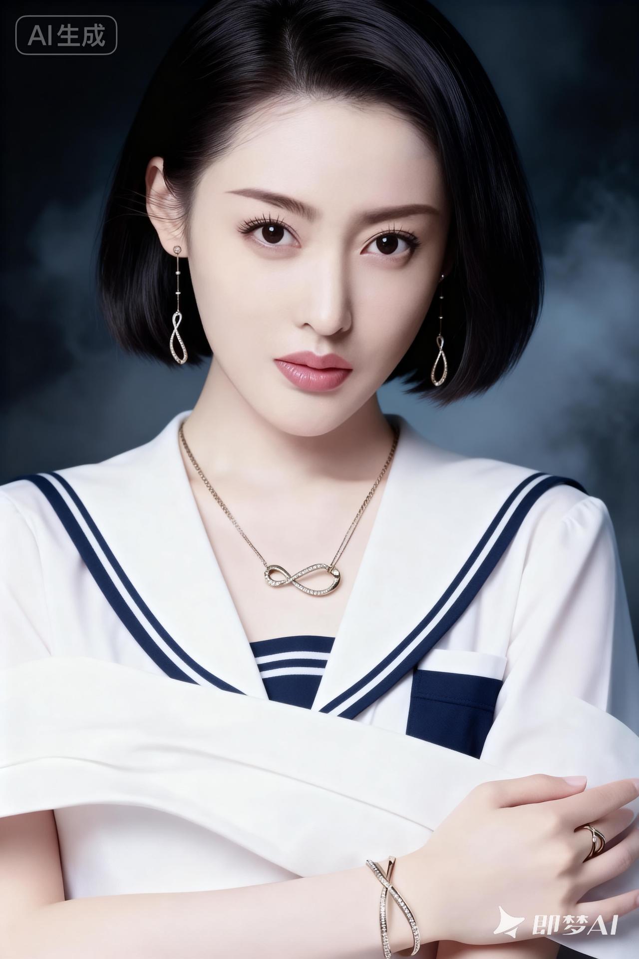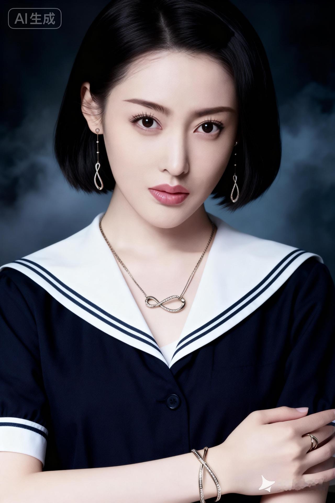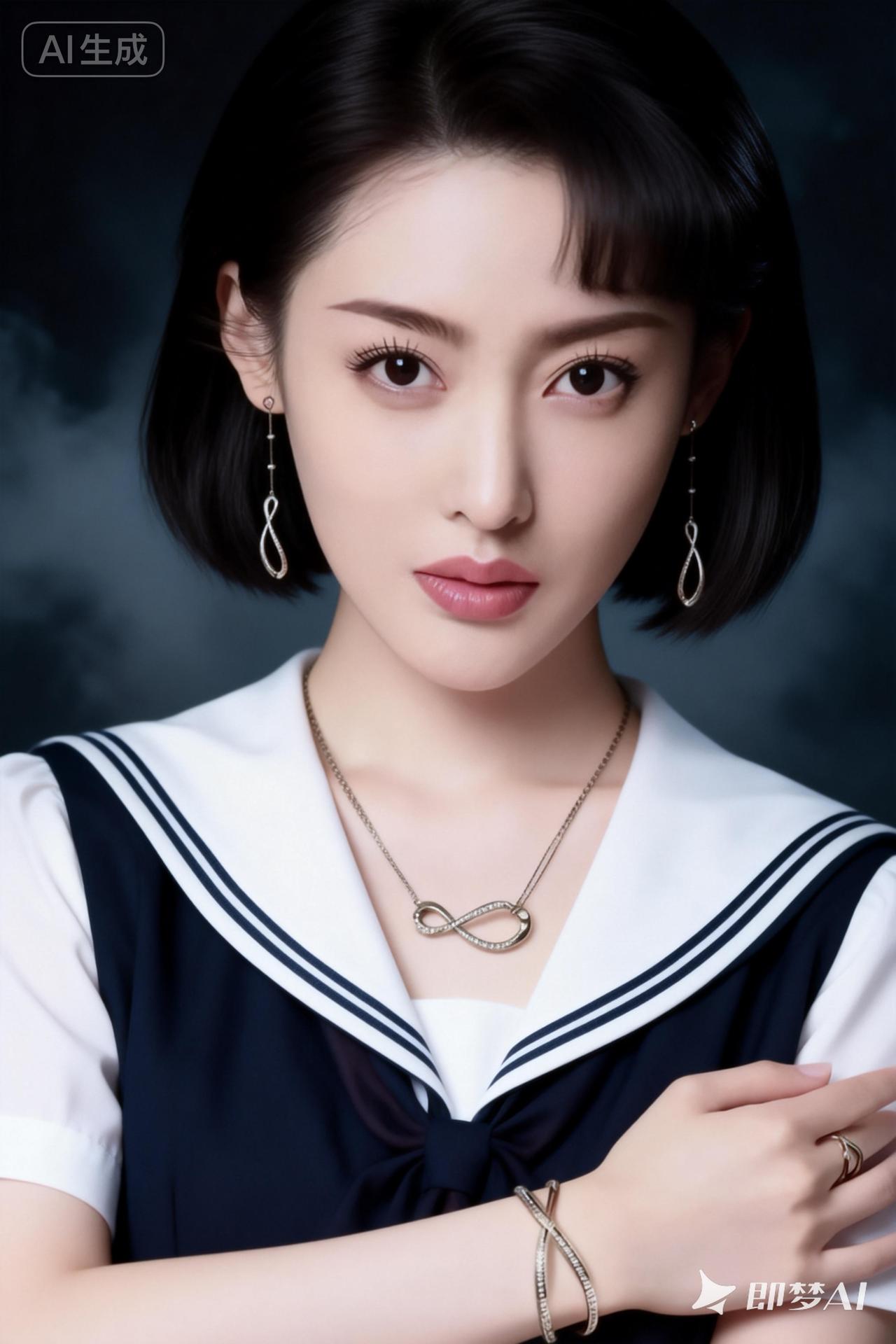 甜美校园风少女,黑发齐刘海,穿着水手服,气质优雅。