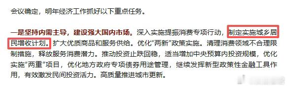 提高收入,最快明年就能落地?好事啊。上周召开的经济工作会议,信息不少,但是有一个跟普通人关系很大:制定实施城乡居民增收计划。这次不一样:首先看优先级,在明年重点工作中,内需放在了第一位,内需工作中,居民增收放在了第二位,优先级还是很高的。其次看具体表述,制定实施,这表明明年不但会形成方案,而且会落地实施,跟之前表态是不同的。我记得提高居民收入的说法,从去年就开始多次提及,但是一直处在政策设计中,迟迟没有落地,很多人都在期待进一步消息。经过了一年的时间,看来相关政策已经成熟了。居民增收计划有哪些呢?简单来说下:1、分配:居民收入与经济增长基本同步其实主要说的就是:提高劳动报酬在初次分配中的比重,这几年特别是今年,宏观顶住了压力,但是微观体感较冷,所以明年需要让居民更多分享到经济发展成果,简单来说,就是提高工资收入,推动企业建立薪酬正常调整制度,这也是反内卷的要求,今年其实已经有企业在涨了,虽然不多。2、就业:持续加大稳就业促增收力度就业是增收的前提,明年提出了:稳岗扩容提质。这个放在民生工作的第一位,优先级最高,明年应该能看到一系列的稳岗促就业的措施。特别是促进重点群体的就业:大学生、农村劳动力转移就业、失业再就业、困难群体等。而且提出了量化要求:每年城镇新增就业稳定在1200万人以上。可以对冲一下就业压力。3、创业:扩大居民经营性和财产性收入这块的话,现在创业应该有不少政策性支持,但是想赚钱也不容易。倒是财产性收入,像是股市啊,可以好好搞一搞,让股民分享一下经济和企业的发展成功。4、城乡:城乡收入相对差距进一步缩小城市就不说了,主要是农村。农村最主要的就是土地,三权分置之后,土地的使用权可以在市场上流通变成钱,同时乡村振兴、以工代赈也可以让农村居民更多增收。5、保障:加强普惠性、基础性、兜底性民生建设给居民兜底保障,给居民省钱,其实也相当于增收了。这块经济工作会议提到很多:教育:增加普通高中学位供给和优质高校本科招生。医疗:优化药品集中采购,深化医保支付方式改革。养老:推行长期护理保险制度,加强对困难群体的关爱帮扶。婚育:倡导积极婚育观,明年力争实现全国生娃基本不花钱。……希望尽早落地,帮助大家增速,提高未来预期,促进经济回暖。就这样。另外:除了居民增收,上周的经济工作会议其实还有很多信息,我们把政策亮点和新的提法单独挑出来,做进一步深度解读,