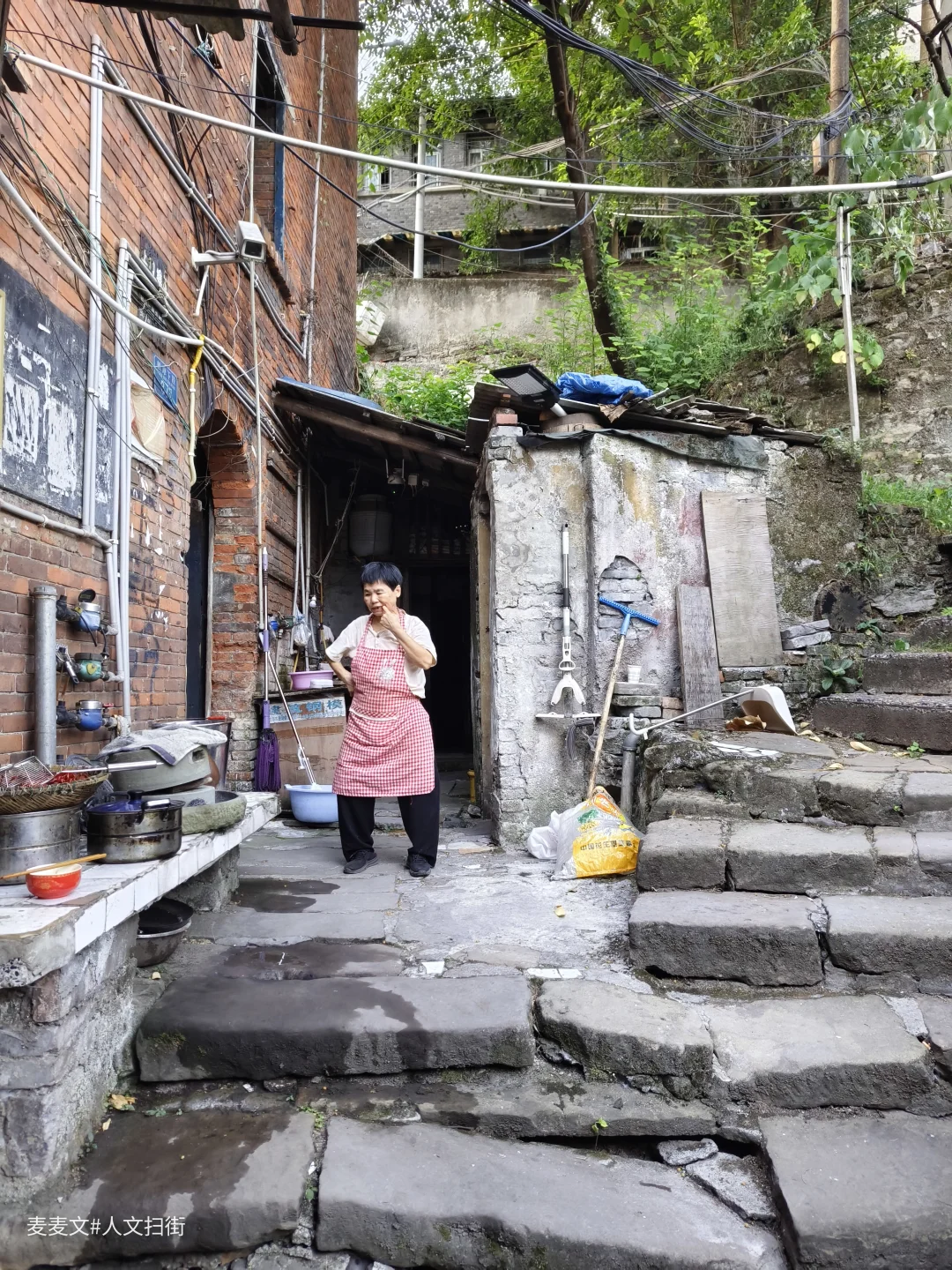 一位身着红白格子围裙的大妈,安静地站在楼外,她的身旁摆放着各种生活物件。老旧的水桶、朴素的陶罐,还有那带着岁月磨损痕迹的石磨,每一件都承载着生活的点滴。