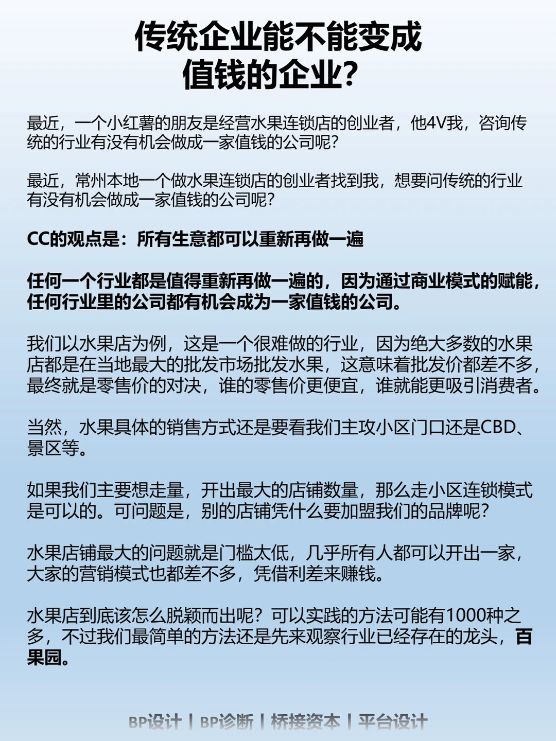 最近,常州本地一个做水果连锁店的创业者找到我,想要问传统的行业有没有机会做成一家值钱的公司呢?