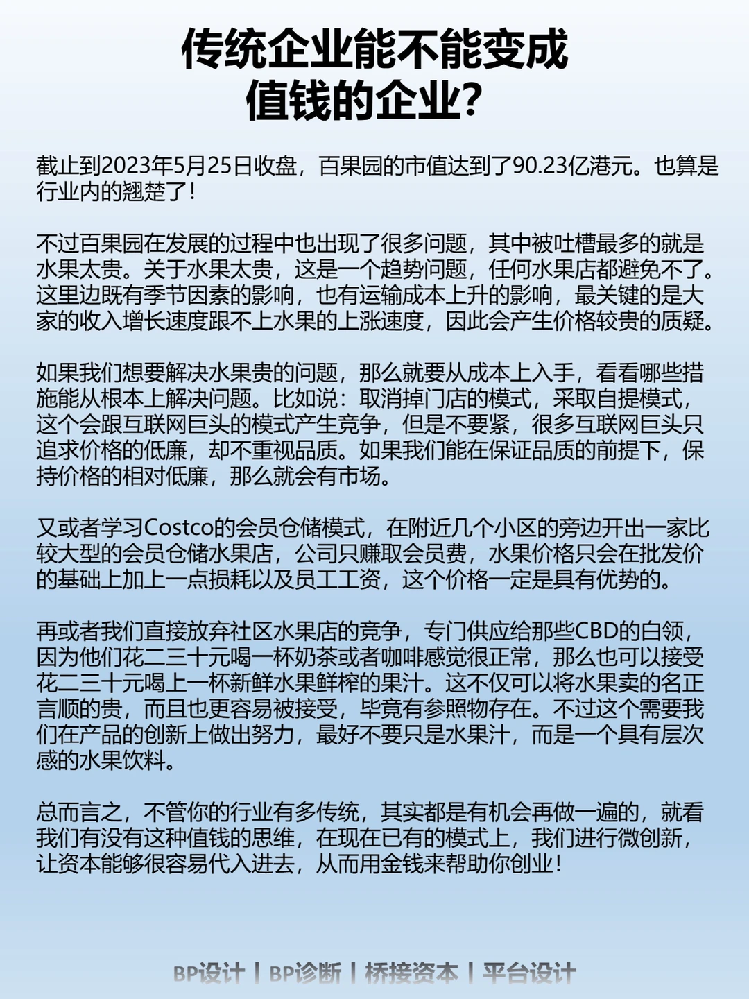 最近,一个小红薯的朋友是经营水果连锁店的创业者,他4V我,咨询传统的行业有没有机会做成一家值钱的公司呢?