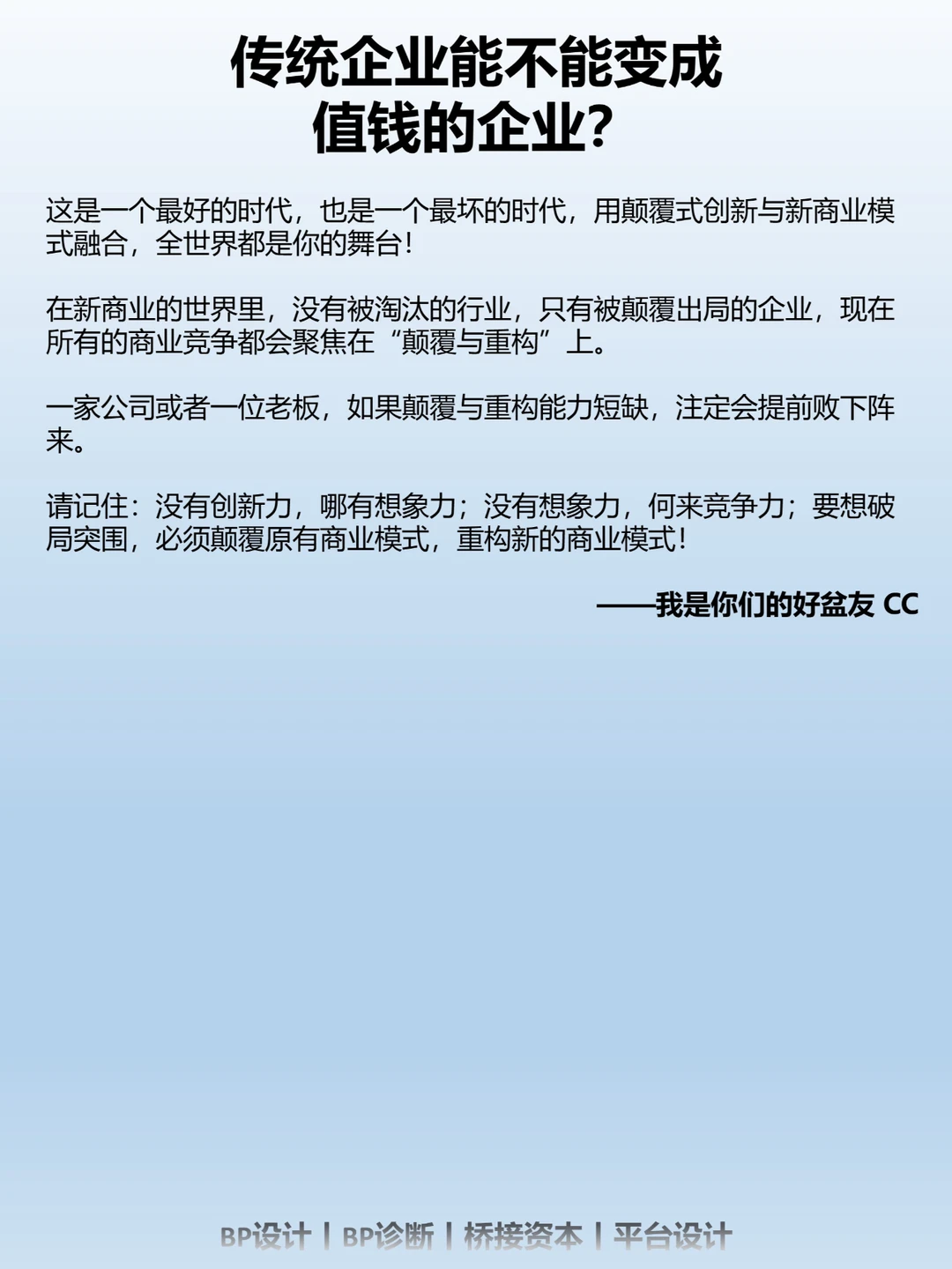 请记住:没有创新力,哪有想象力;没有想象力,何来竞争力;要想破局突围,必须颠覆原有商业模式,重构新的商业模式!