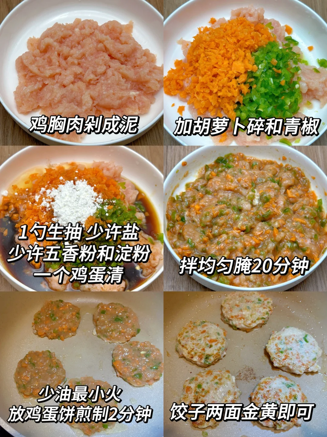 1⃣️把胡萝卜和青椒剁碎,鸡胸肉剁成泥,把所有食材搅拌均匀
