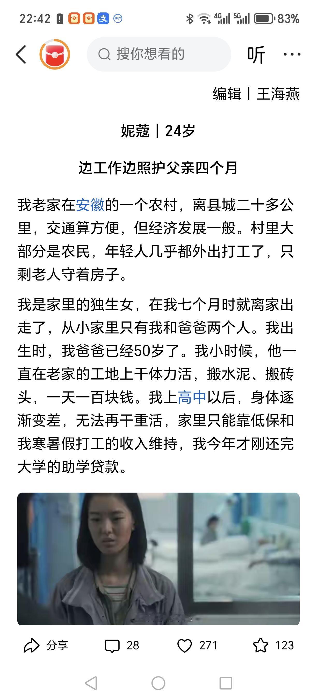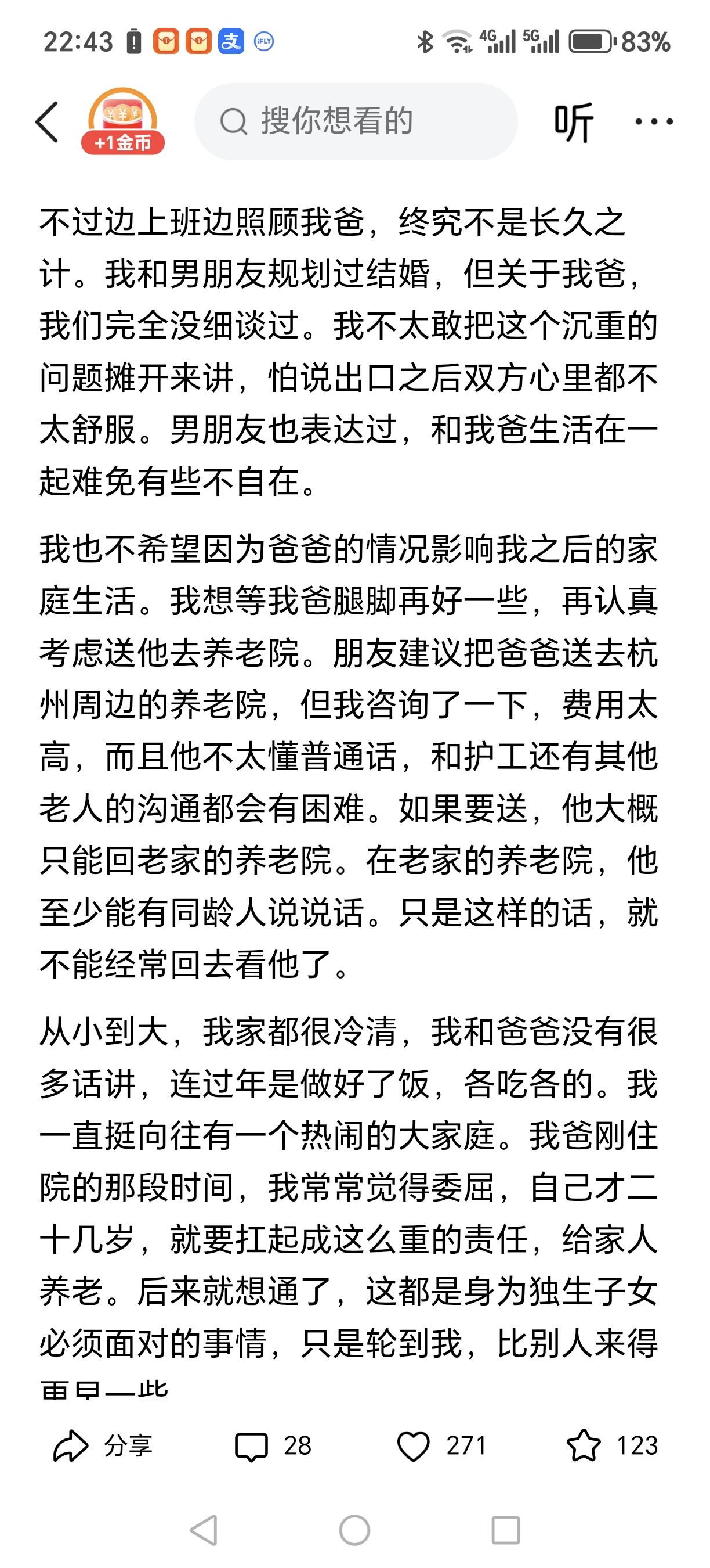 养儿防老,的确是一个沉重的话题,对于00后的独生子女来说,更是特别艰难。 00后,面临着工作与照顾父母的双重责任与义务。自古忠孝不能两全。00后,大学刚毕业,还未工作,却因为父母的身体,不得不专职伺候父母。反映的问题太现实了。 要工作,便不能很好地照顾父母,要照顾父母,在压力山大的工作面前,就无能无力。 独生子女的父母,将来最好的出路就是养老机构。父母如果没有好的收入来源,对孩子来说,就是一种拖累,苦不堪言。 养儿防老,真的很难。